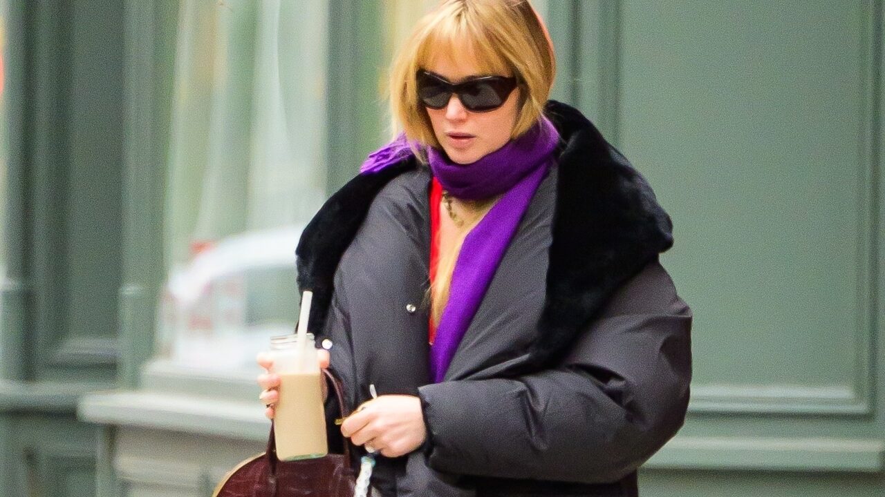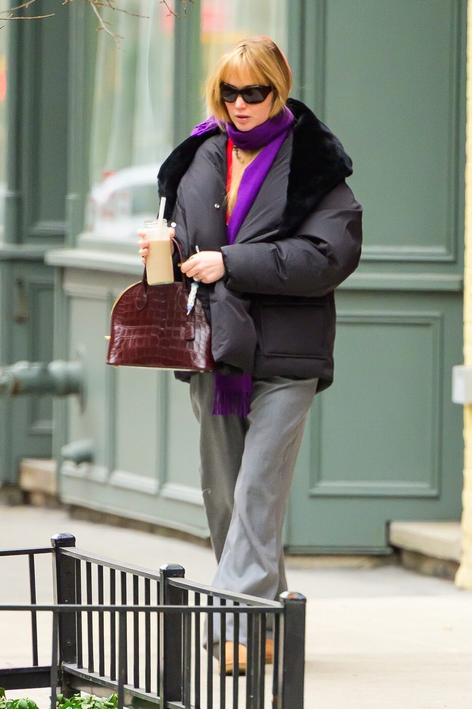 영하의 날씨에 패딩을 꺼내 입는 건 당연한 일 아니겠어요? 제니퍼 로렌스 또한 뉴욕의 한파에 맞서 두툼한 블랙 패딩을 입었습니다. 헐렁한 와이드 팬츠에 벨벳 후드가 달린 패딩 룩을 마무리한 건 클래식한 브라운 크로커다일 텍스쳐의 토트 백과 선명한 보라색의 목도리였어요. 크진 않지만 모노톤의 룩에 확실한 포인트가 되기에 제격인 비비드한 컬러의 머플러를 한 제니퍼 로렌스.