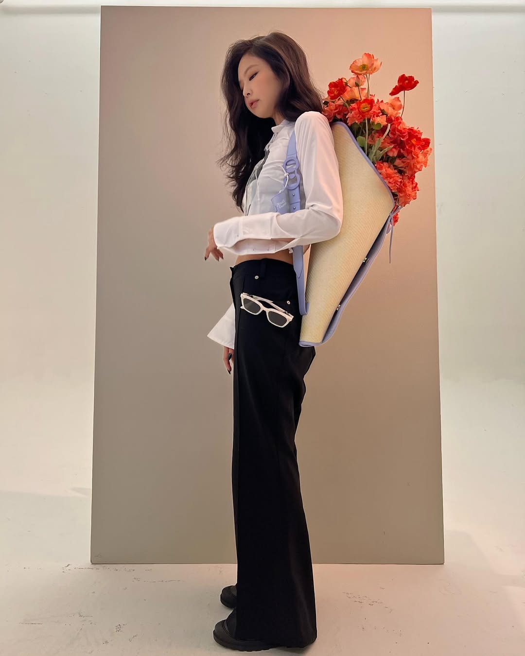캐주얼한 룩을 즐겨 입는 제니는 셔츠를 자주 입는 편은 아닌데요. 화이트 셔츠를 입은 제니의 모습을 보려면 꽤 과거로 거슬러 올라가야 합니다. 2021년 앳된 얼굴의 제니는 크롭 셔츠와 부츠 컷 팬츠의 조합으로 트렌디한 셔츠 룩을 선보였어요. 셔츠 전면의 프린팅은 크롭한 실루엣을 어색하지 않게 뒷받침하죠.