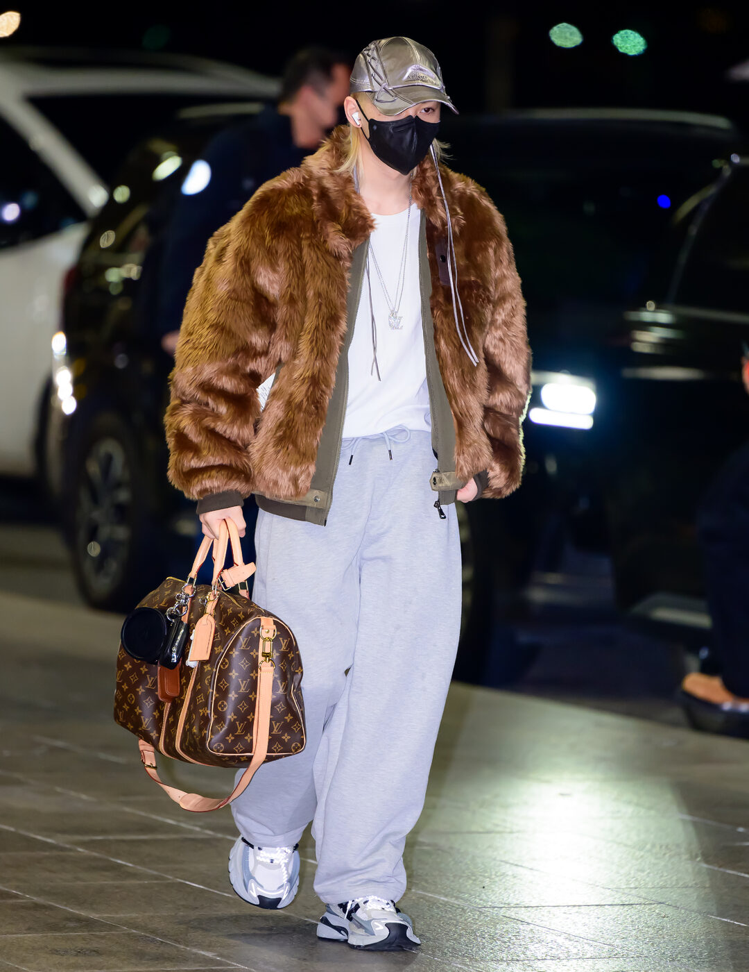 회색 스웨트 팬츠는 누구나 옷장에 하나쯤 가지고 있을 법한 기본템이죠. 하의는 단순하게 연출해도 존재감 있는 아우터 하나만으로도 충분히 스타일리시해 질 수 있어요. 스트레이 키즈 필릭스는 이 익숙한 아이템을 브라운 퍼 재킷과 함께 연출해 고급스럽게 중화시켰습니다.
