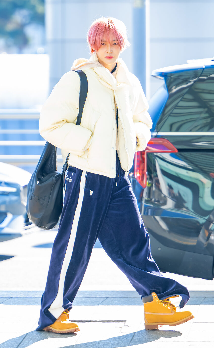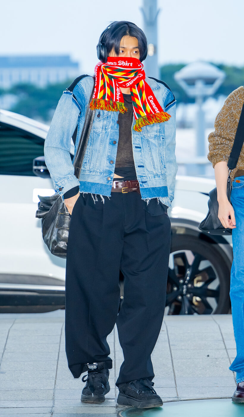편하고 캐주얼한 스타일을 추구한다면 남자 아이돌들의 공항패션도 눈 여겨 봐야 해요. 넉넉한 사이즈와 손이 자주 갈 법한 베이식한 아이템들로 꾸미지 않은 듯 자연스러운 룩들이 자주 포착되거든요. 투모로우 바이 투게더 연준은 준야 와타나베 데님 재킷과 블랙 오버핏 팬츠를 매치해 쿨한 공항 룩을 선보였습니다. 풋볼 머플러에서 영감을 받은 유니크한 디자인의 레드 패턴 머플러가 룩에 생기를 더했죠.