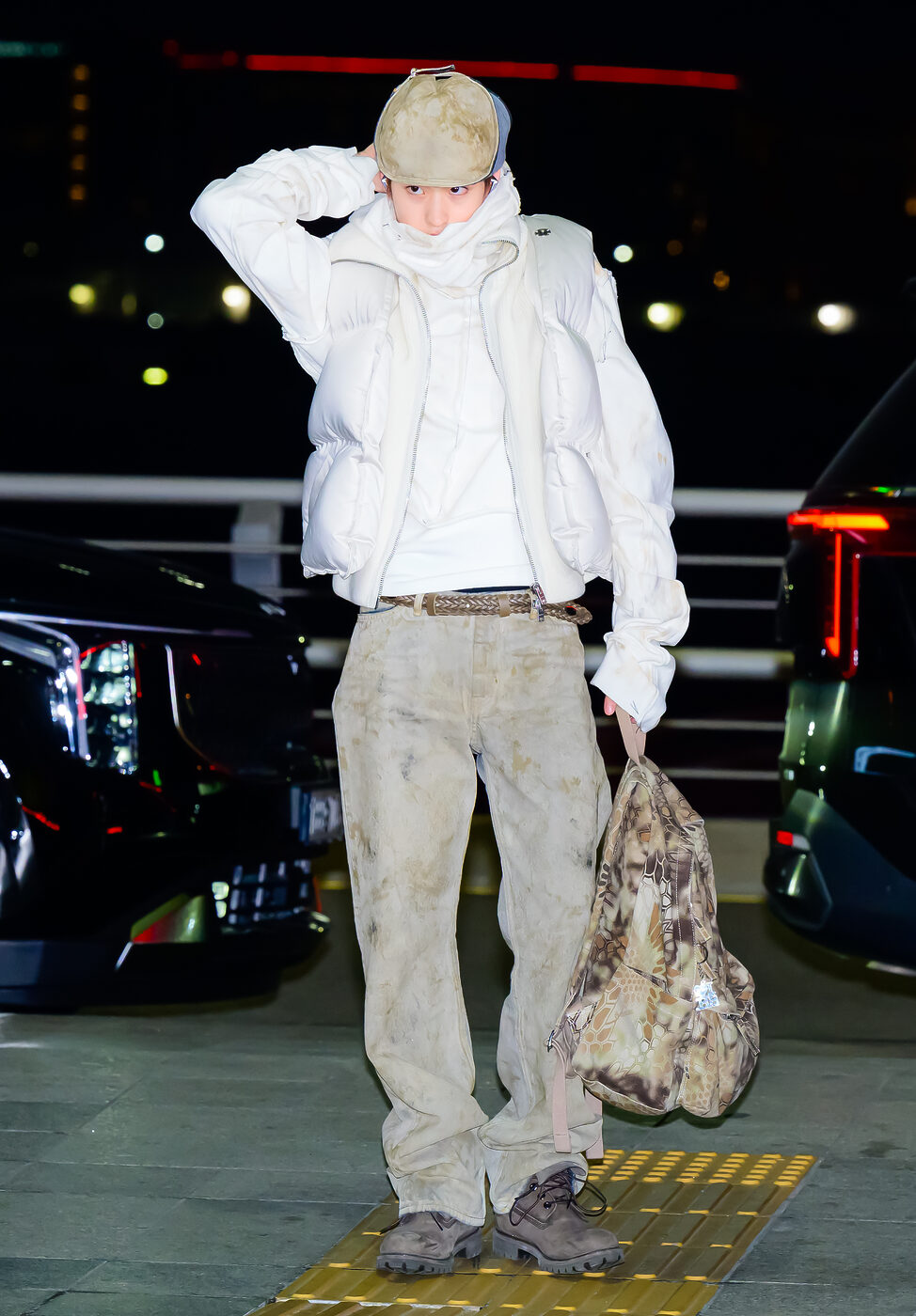 포근한 숏패딩과 트레이닝 팬츠 조합은 자칫 스포츠웨어처럼 지나치게 캐주얼해 보일 수 있는데요. 라이즈 원빈은 여기에 워크 부츠를 매치해 무게감을 더했어요. 편하고 심플한 룩일수록 전체 분위기를 잡아주는 슈즈 선택이 더욱 중요하겠죠?
