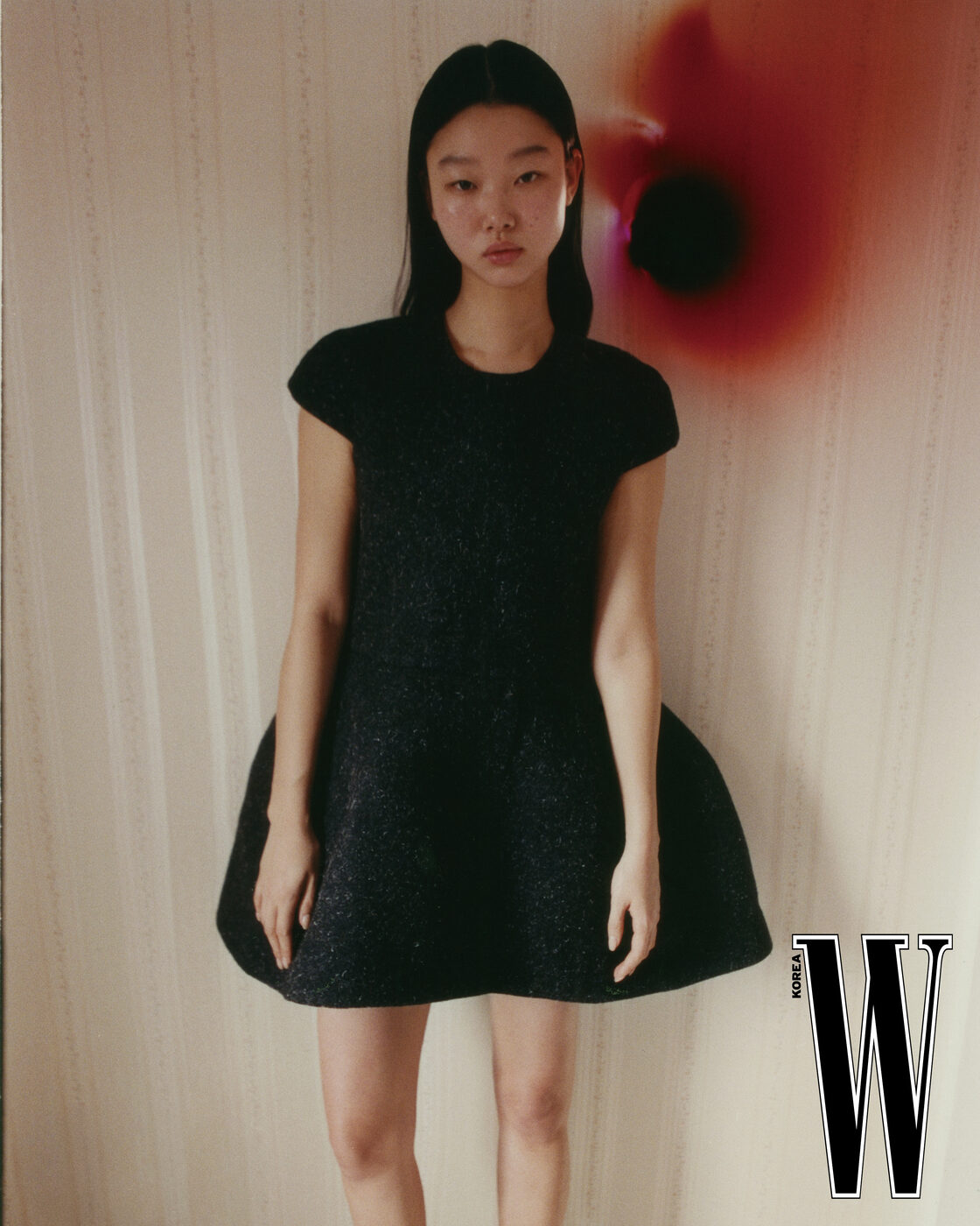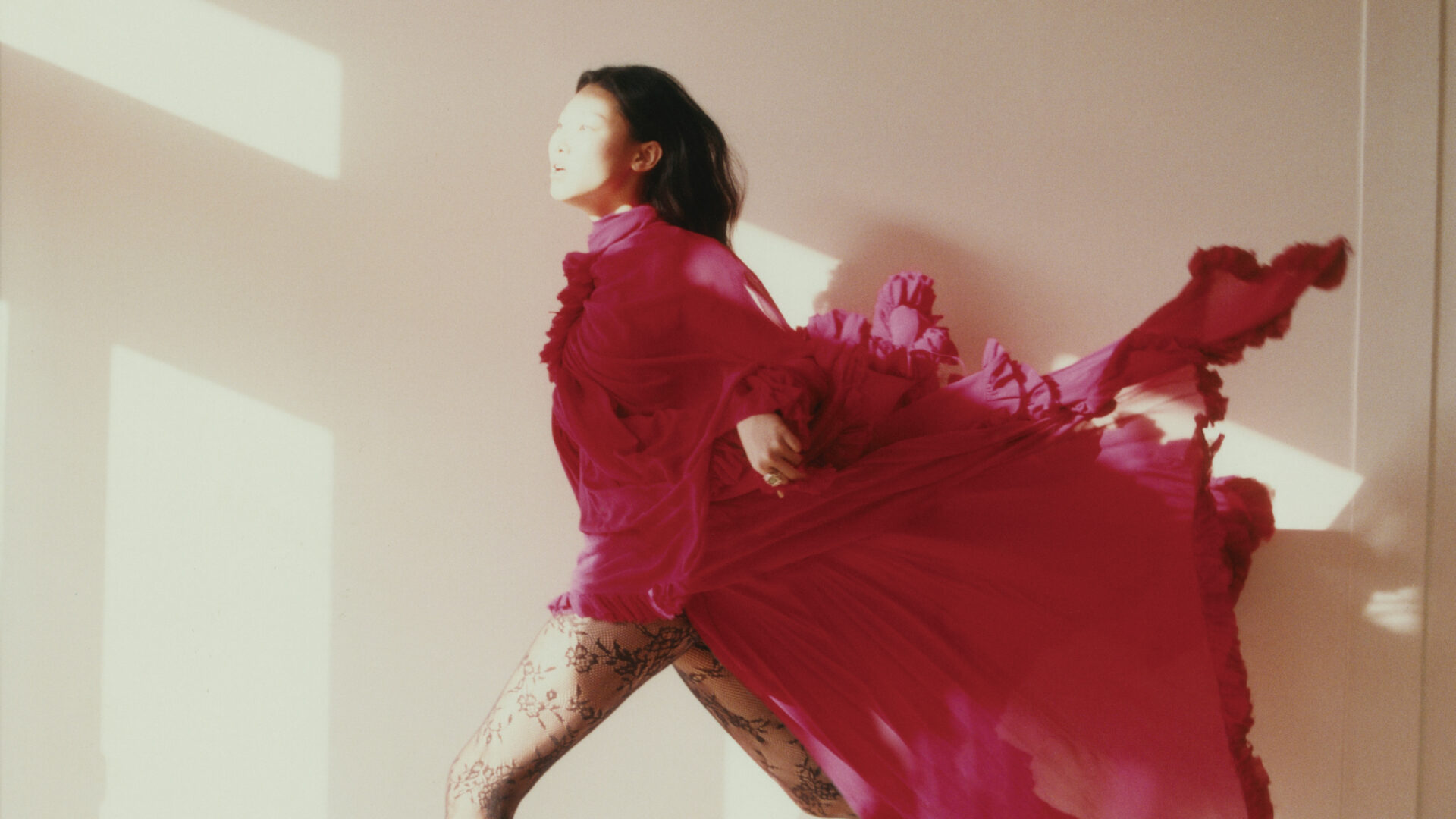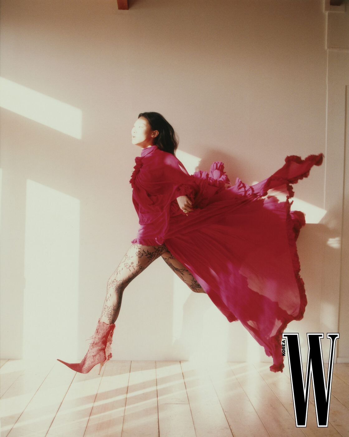 빨강 러플 드레스, 레이스 타이츠, 레이스 부츠는 McQueen 제품.