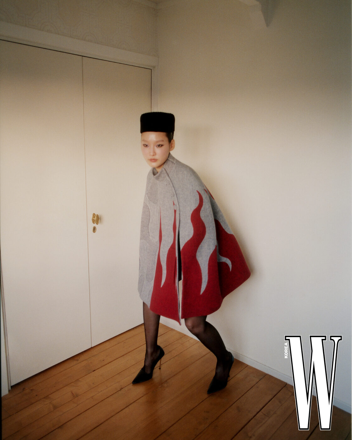 회색 케이프와 모자, 슈즈는 Louis Vuitton 제품.