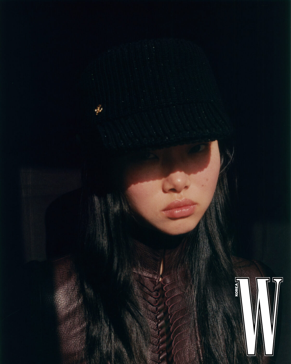 니트 모자는 Louis Vuitton, 가죽 볼레로는 Alaia 제품.