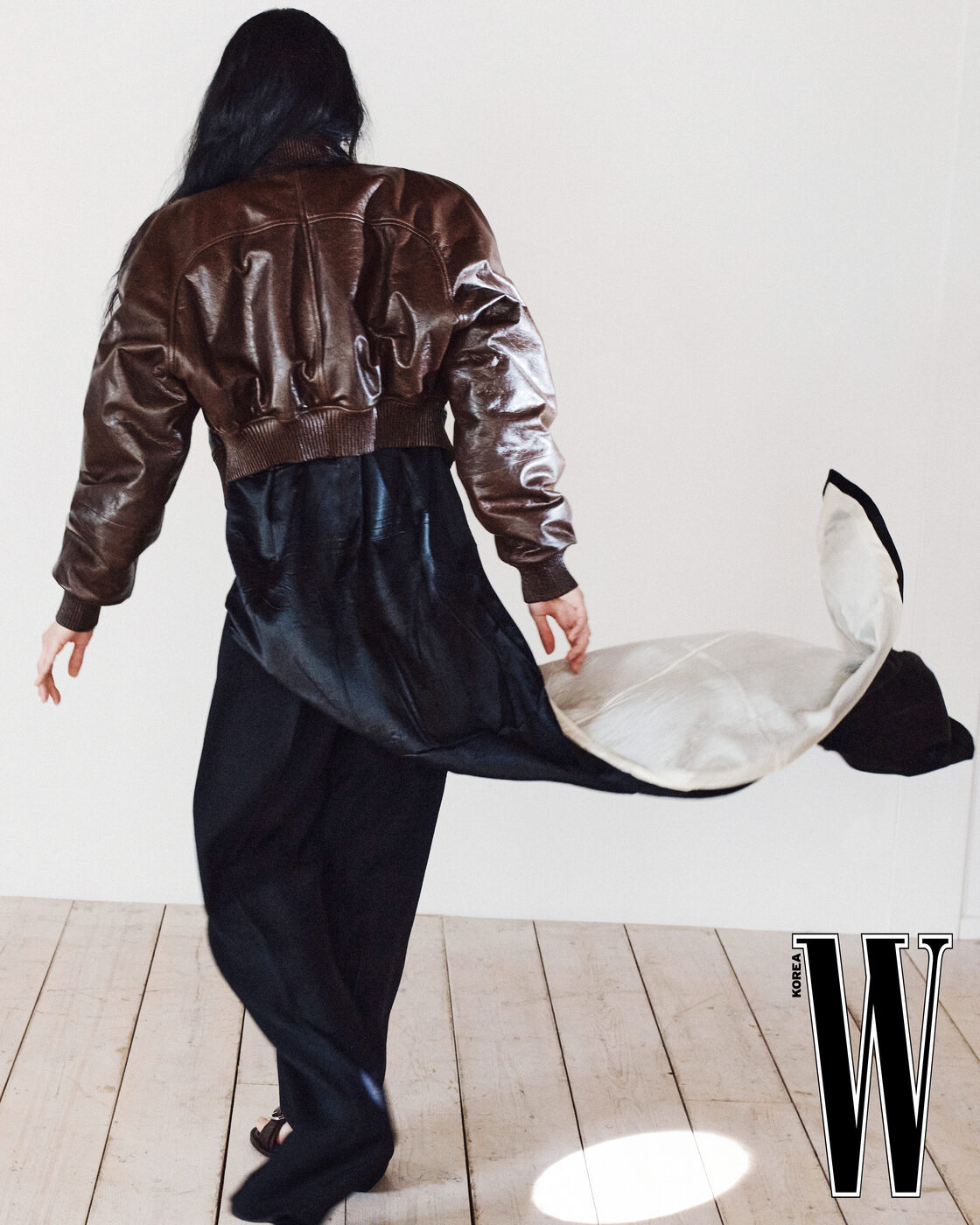 가죽 블루종, 안에 입은 롱 테일 실크 셔츠, 팬츠와 슈즈는 Phoebe Philo 제품.