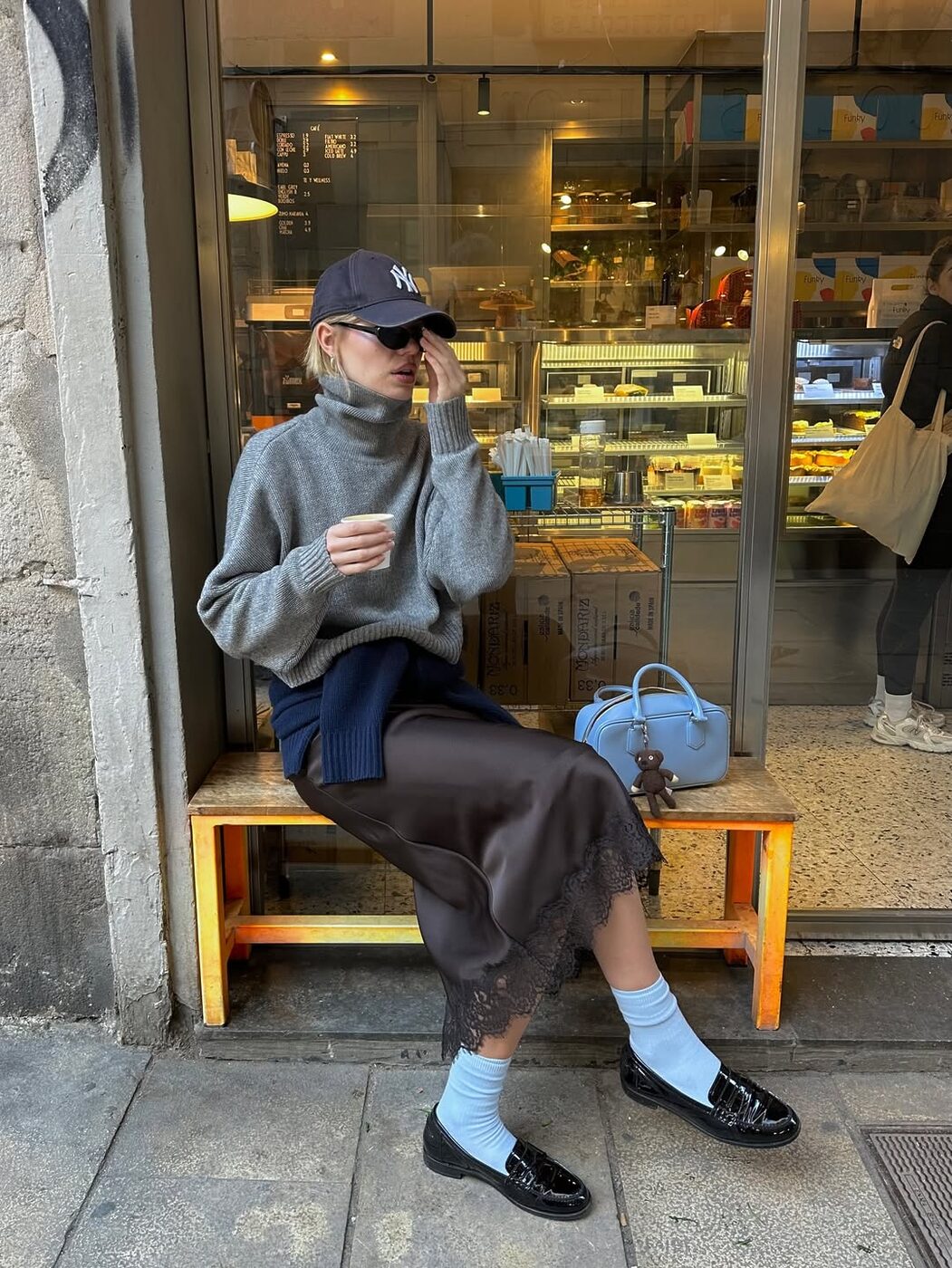 이 연출법은 캐주얼한 팬츠 룩에만 국한되지 않아요. 슬립 스커트와 같이 잘 차려입은 듯한 페미닌한 아이템에 매치할 때 더욱더 진가가 드러납니다. 특유의 여성스럽고 로맨틱한 분위기는 유지하면서 드레스 다운한 듯 위트와 센스를 동시에 줄 수 있으니까요.
