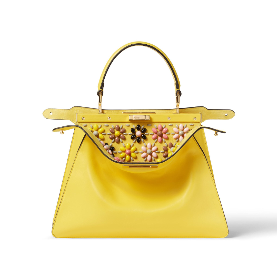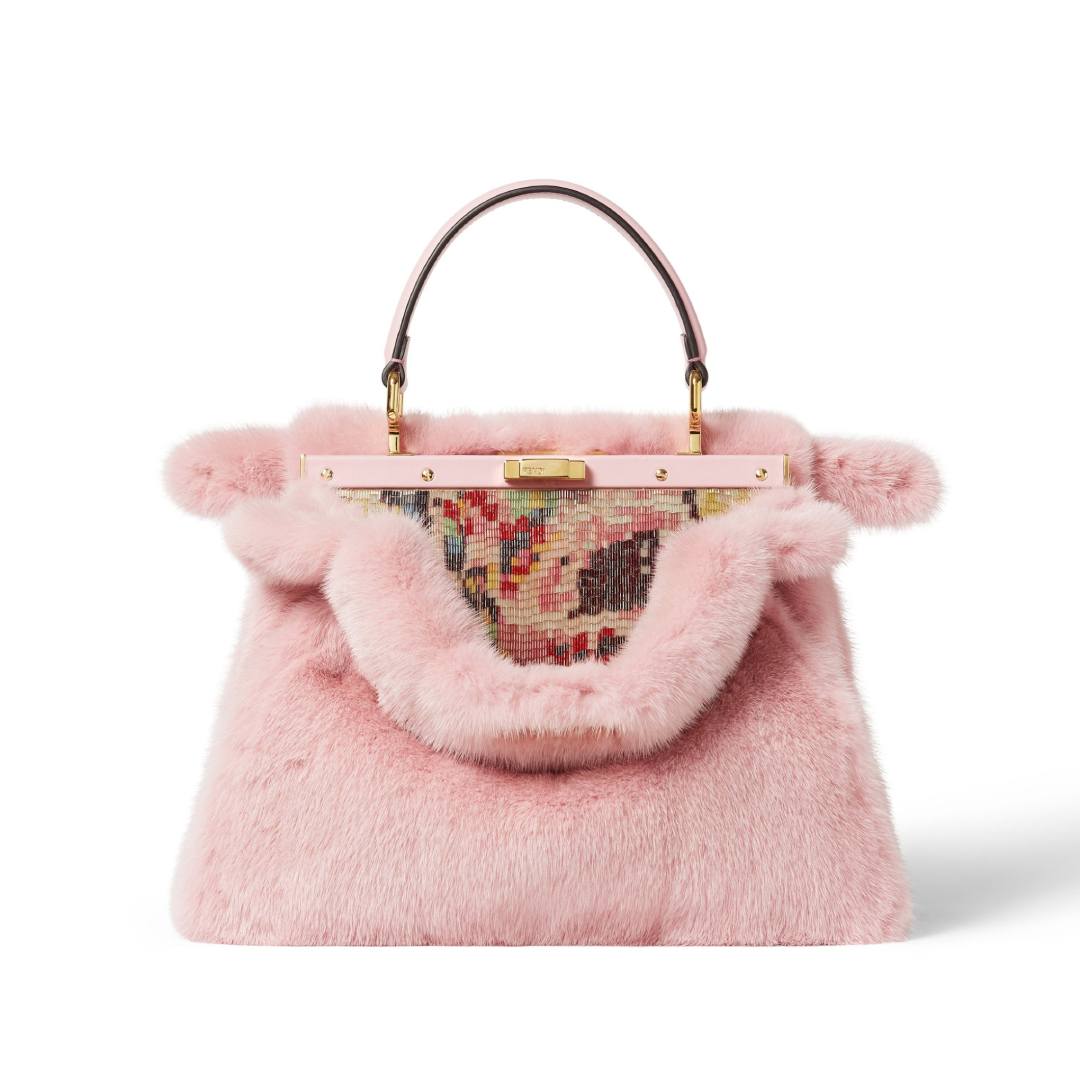 화려한 파예트 장식은 40시간 이상의 수작업을 거쳐 다양한 형태로 구현됐다. 마호가니 브라운 피카부 백 내부를 채운 퍼플 파예트, 비대칭적으로 배열된 터키석과 길게 늘어진 그린 파예트는 컬렉션에 리드미컬한 에너지를 더한다. 옐로 피카부 백 안쪽에는 멀티컬러 플라워 스터드가 입체적인 모자이크처럼 펼쳐지고, 크리스털 플라워 모티프는 주얼리 같은 섬세한 포인트를 완성한다. 소재에 대한 펜디 하우스의 노하우를 집약한 핑크 밍크 피카부 백은 멀티컬러 핸드 비딩 자수로 추상적인 플로럴 모티프를 구현했으며, 제작에만 무려 200시간 이상의 시간이 소요됐다.