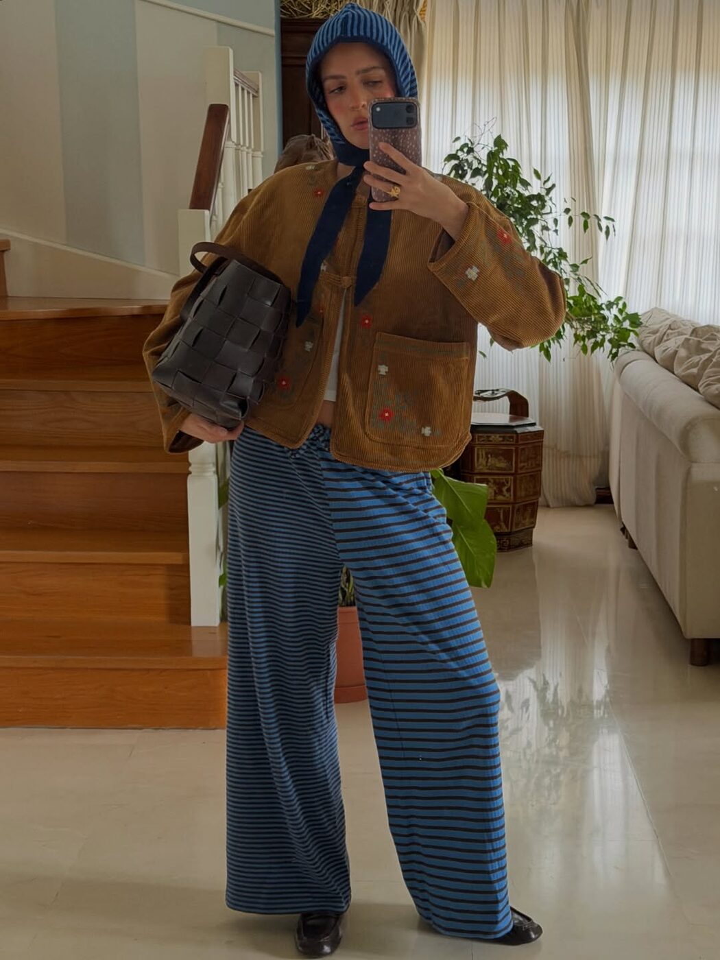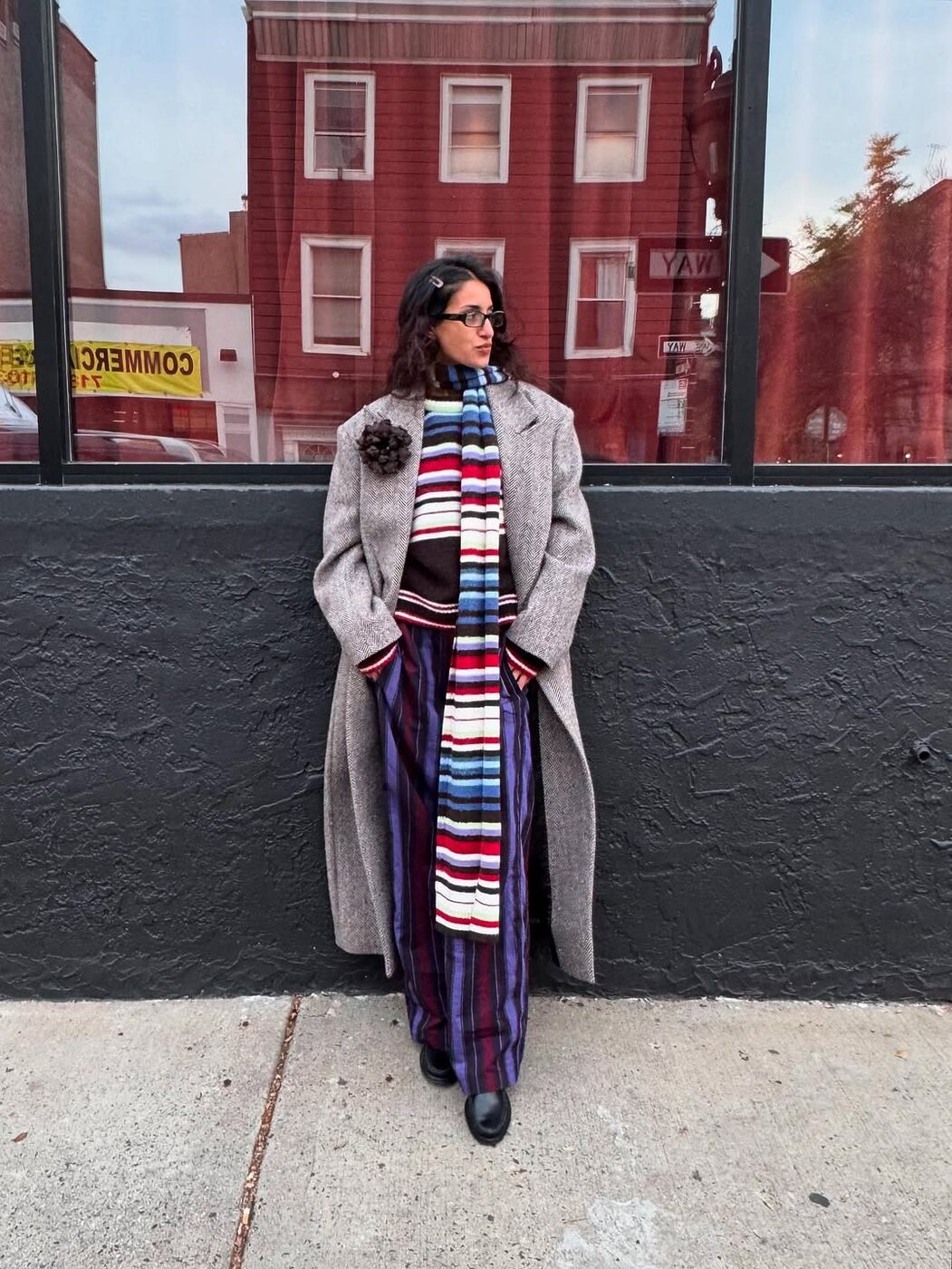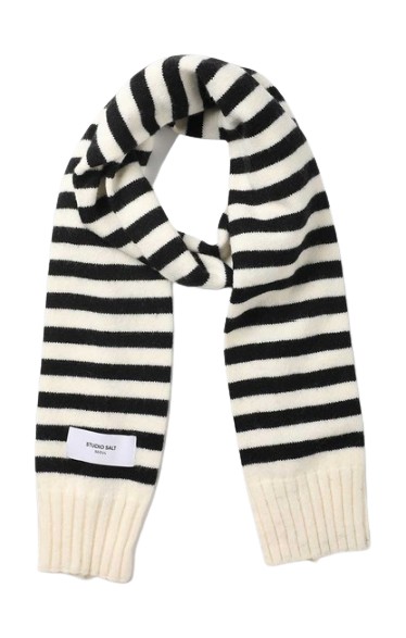 다양한 스트라이프 레이어링으로 경쾌하게 스타일을 풀어낸 아나. 같은 패턴의 니트 톱과 목도리에 흔한 가로 스트라이프가 아닌 세로로 된 팬츠로 옷차림을 완성했습니다. 아나의 룩이 이토록 재밌는 이유는 패턴을 계산적으로 다룬 점인데요. 스트라이프로 점철된 스타일링 속 화이트를 더해 줌으로써 패턴의 답답함을 중화하고 상하의에 공통으로 들어간 어두운 퍼플 컬러를 하의로 선택해 룩의 균형을 맞춰주었죠. 여기에 상의 패턴과 의도적으로 맞춰진 듯한 스카프까지 더해지니 들여다볼수록 디테일이 가득한 옷차림입니다.