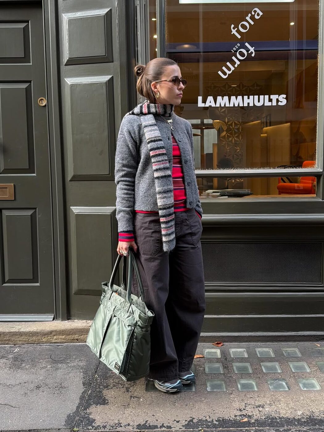 샬롯 올리비아는 함께 입은 옷들에 맞춰 스트라이프 패턴을 더해주었습니다. 레드 스트라이프 니트에 걸쳐 입은 그레이 니트 카디건과 같은 톤의 레드가 은은하게 섞인 스카프를 둘러주었는데요. 이제껏 봐온 동색의 스트라이프 매치와 다르게 포인트로 패턴을 활용했지만 룩에 결정적인 역할을 한 아이템이기도 하죠.