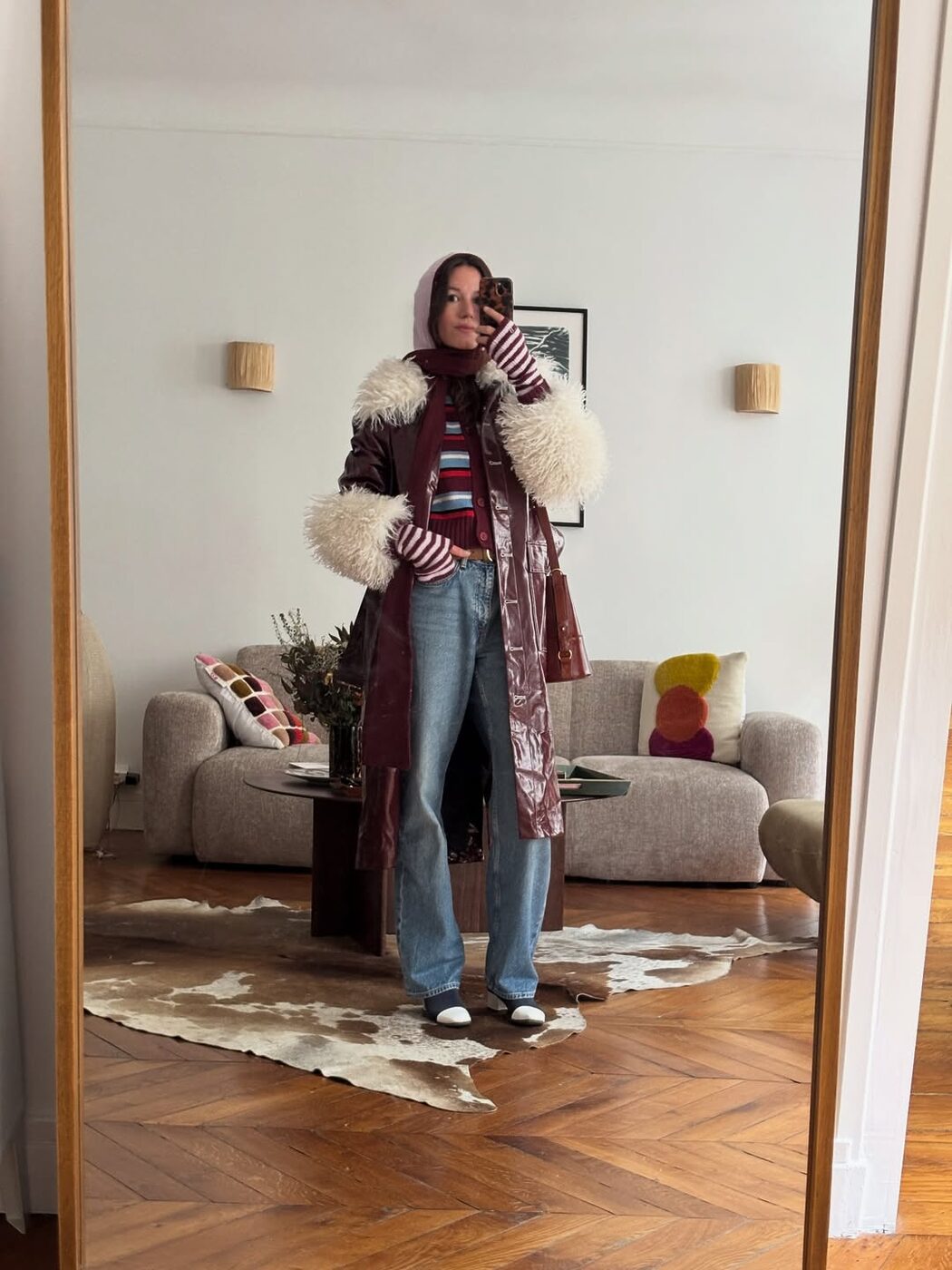 흐린 겨울 날씨에 확실한 에너지를 주는 레드 컬러는 스트라이프 패턴 플레이에서도 유효합니다. 레드가 섞인 핸드 워머와 카디건을 레이어드한 로렌사 도레이. 아우터의 소매를 걷어 스트라이프 장갑을 드러낸 감각을 엿볼 수 있는데요. 올겨울 퍼 트리밍 코트와 데님 조합에 패턴을 더해 룩의 분위기를 가볍게 전환시켜보는 것도 좋은 방법이겠죠.