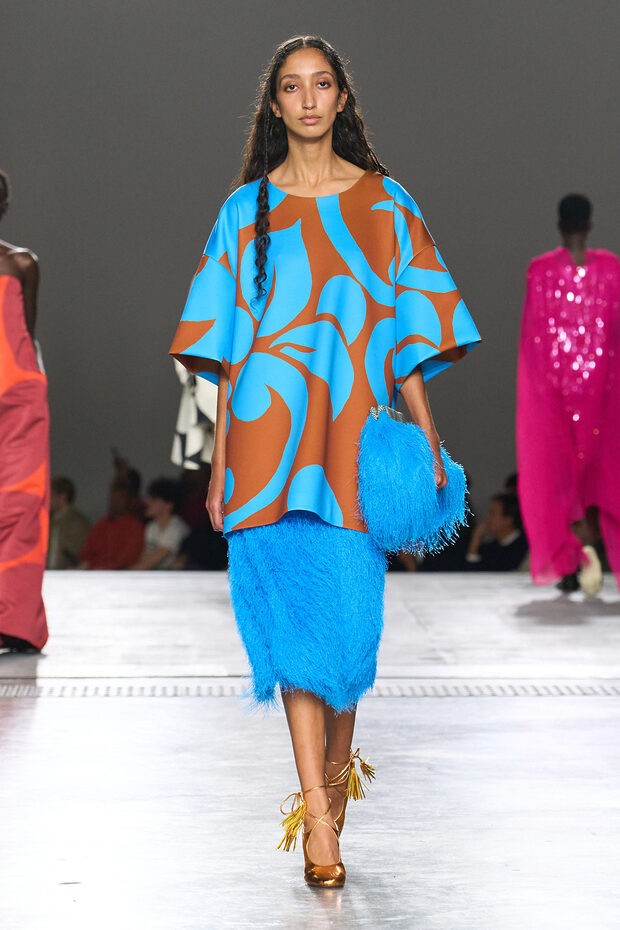 가을, 겨울이 아닌 봄, 여름 시즌이 분명합니다. 그럼에도 디자이너들은 풍성하고 화려한 깃털을 쓰는데 망설이지 않았어요. 발렌시아가에서는 핑크색의 머메이드 라인의 깃털 장식 스커트를, 보테가 베네타에서는 퓨처리스틱한 헤어리 미디 스커트로 장인정신이 깃든 아이템들을 선보였습니다. 상의는 심플하고 모던함을 유지하는 게 기본 자세죠. 드리스 반 노튼은 비비드한 터쿼이즈 컬러의 퍼 스커트에 그래픽이 더해진 빅사이즈 톱으로 선명하고 볼드한 컬러 룩을 완성해 보이기도 했어요.