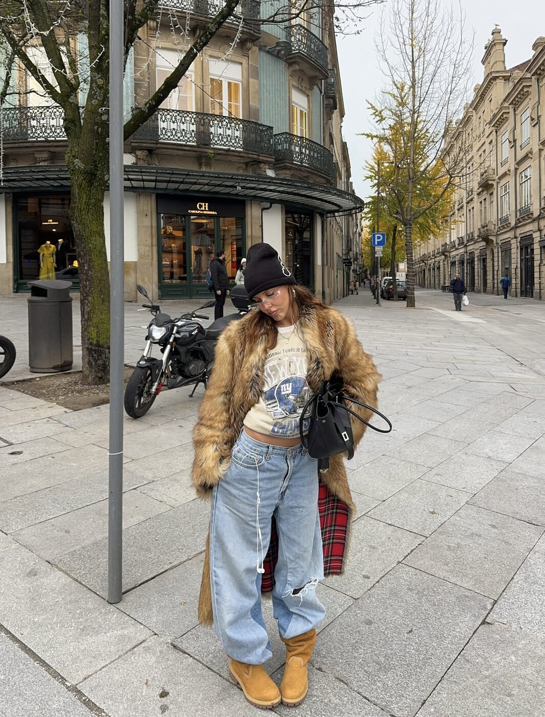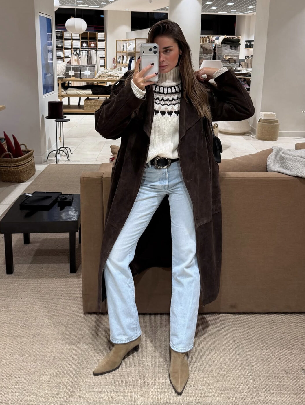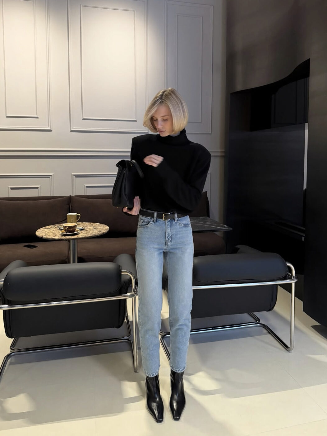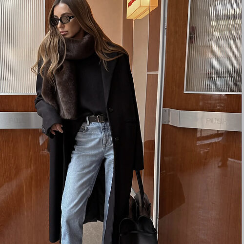 이 룩이 스타일리시하게 보이는 것도 역시 컬러에 있습니다. 진한 데님이었다면 카멜이나 밝은 브라운과 미묘하게 상충할 조합인데, 연청을 고르면서 선택지가 넓어졌죠. 카멜 퍼 코트와 부츠도, 안쪽의 레드 체크 안감도 다 품는 범용성을 느껴보세요.