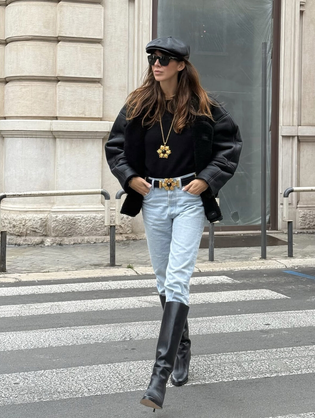 시어링처럼 소재가 분명한 아우터를 고르면 다리가 더 말라보이는 효과를 동반할 수 있겠죠. 액세서리는 연청의 존재를 해치지 않는 선에서 힘을 더했습니다. 버클 벨트와 롱 부츠, 캡과 선글라스까지. 포인트는 분명하지만, 어디까지나 바지를 돋보이게 하는 역할에 가깝죠.
