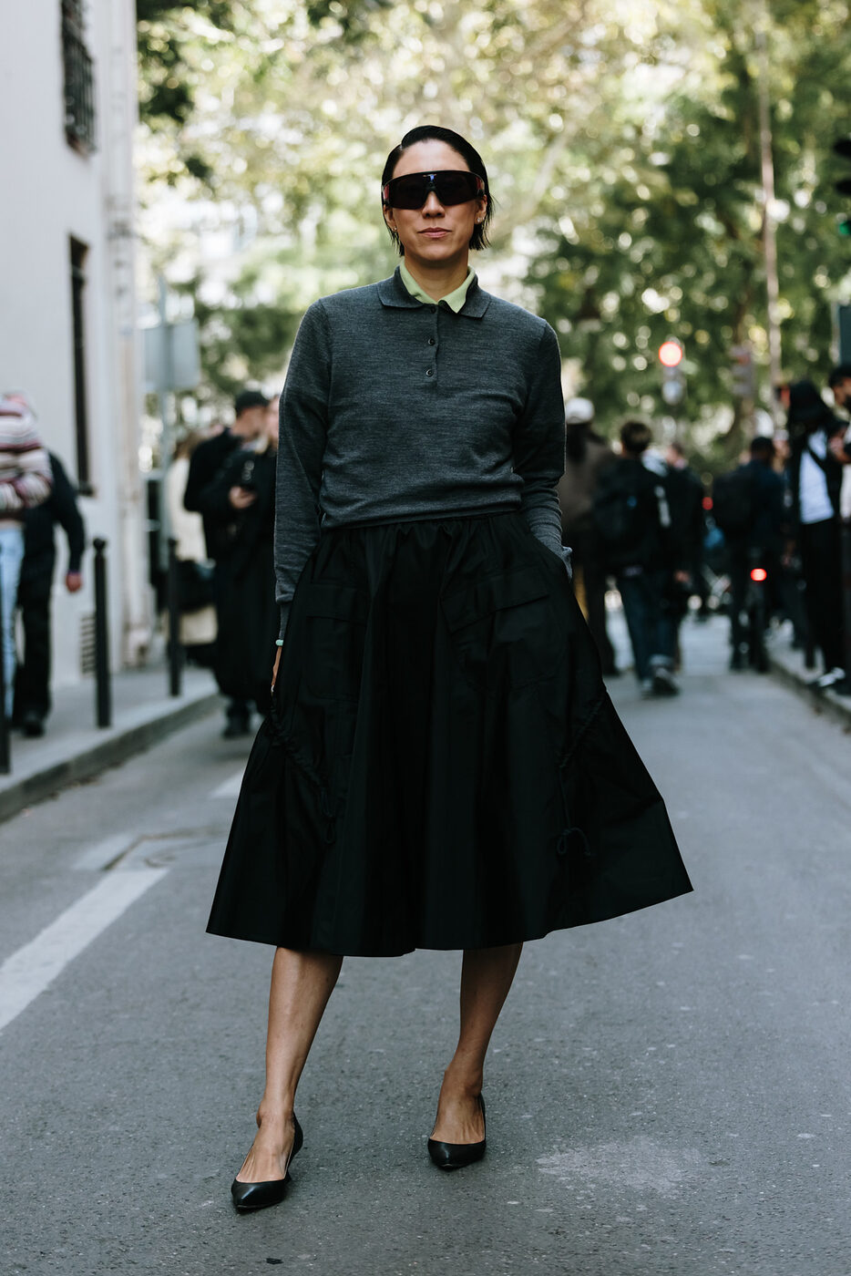 유독 시크하고 여성스러운 펜슬 스커트 룩에 퓨처리스틱한 선글라스가 세련된 매칭을 이룹니다. 셔츠와 레더 스커트, 슬링 백 슈즈의 전형적인 오피스 걸을 비롯한 레이스 트리밍의 스커트와 블레이저 룩에도 얼굴의 반을 가리는 커다란 고글 형태가 의외의 멋을 선사해요.