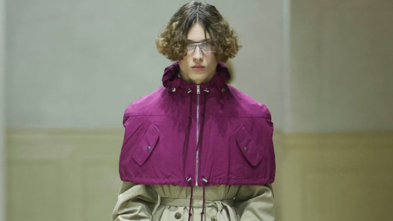 아일랜드 포스트 펑크 밴드 버진 프룬스(Virgin Prunes)와 미국 일렉트로닉 펑크 듀오 수이사이드(Suicide)의 으르렁거리는 듯 거친 사운드의 BGM이 시작부터 긴장감을 끌어올렸다. 덤덤한 표정과 구부정한 자세로 런웨이에 등장한 모델들은 슬림한 스트레이트 라인의 튜뷸러 코트를 입고 있었다. 평범해 보이지만 코트의 소매 밖으로 무심히 접어 올린 커다란 셔츠 커프스가 단번에 시선을 끌었다. 클래식 자수와 커프스 버튼이 달린 커다란 소매에는 때가 탄 흔적과 커피 얼룩처럼 보이는 오염이 남아 있었고, 대담하게 칼라를 제거하고 여밈을 등 쪽으로 바꿔버린 셔츠에는 접힌 자국과 구김이 그대로 드러났다. 트렌치코트 위에 짧은 유틸리티 케이프를 겹쳐 입히고, 어깨 부분에 납작하게 눌린 버킷 햇을 붙이는 파격도 등장했다. 셔츠 커프스의 오염처럼 ‘낡음의 미학’은 컬렉션 전반으로 퍼져나갔다. 뉴스보이 캡, 트렌치코트, 트레일 부츠 끈과 가방까지 거뭇한 흔적이 번져 있었다. 니트 풀오버는 네크라인이 늘어진 듯 깊게 파인 험블한 형태로 제시되었고, 브라운 톤의 점퍼와 코트에는 구겨진 텍스처가 강조됐다. 맥코트와 점퍼는 칼라와 햄 라인, 스티치 가장자리에 산화된 듯한 마감으로 안감의 트위드가 드러나도록 설계됐다. 프린트 역시 과거의 파편을 콜라주했다. 후반부에 나온 셔츠의 현란한 프린트는 16세기의 델프트(Delft) 타일, 풍경화, 이집트와 그리스 유물의 파편 이미지를 레이어드한 것. 프라다는 이처럼 오래전부터 존재해왔던 것들에 미묘한 트위스트를 더하며 더블 버튼 코트 같은 전형적 아이템조차 새롭게 탈바꿈시켰다.