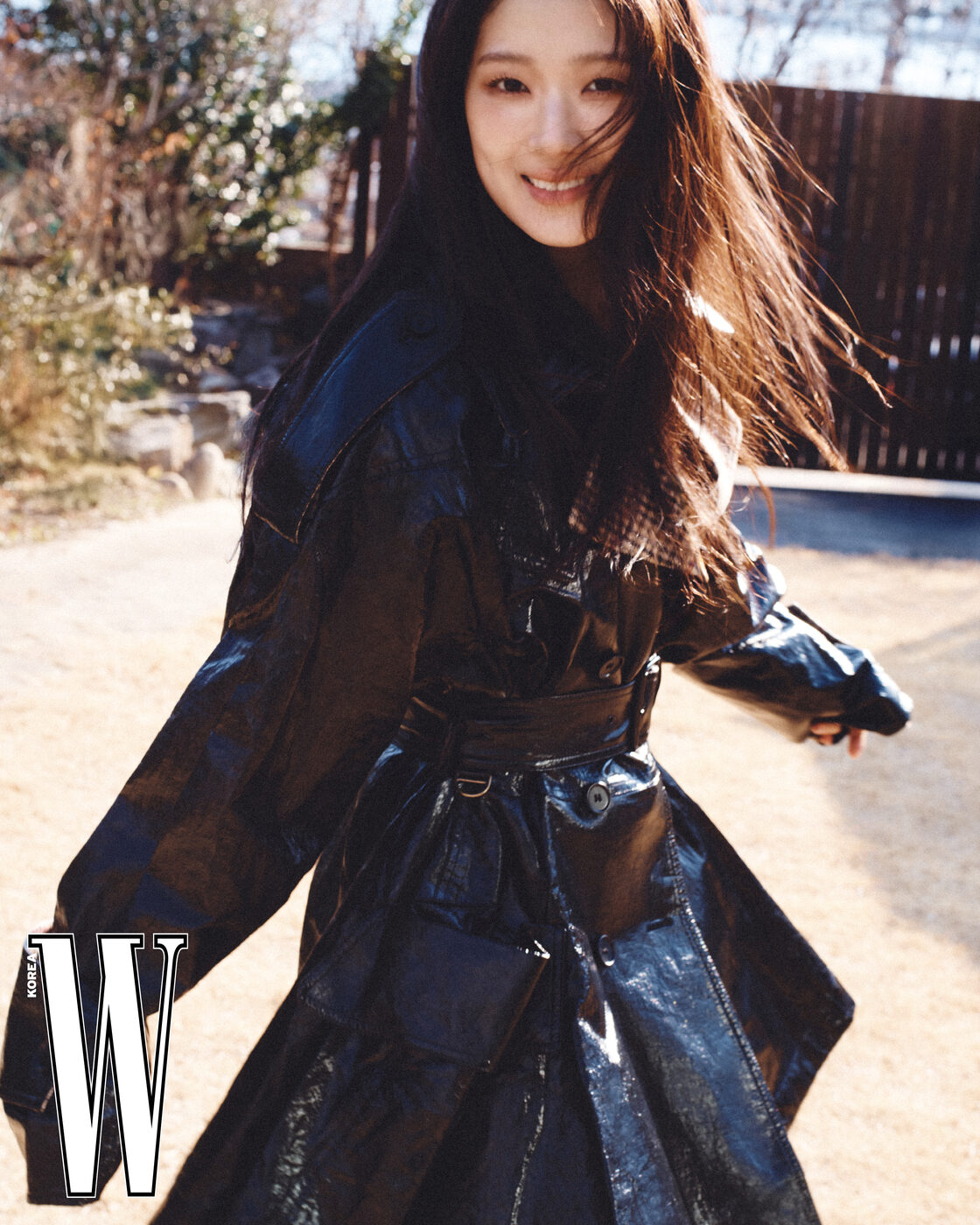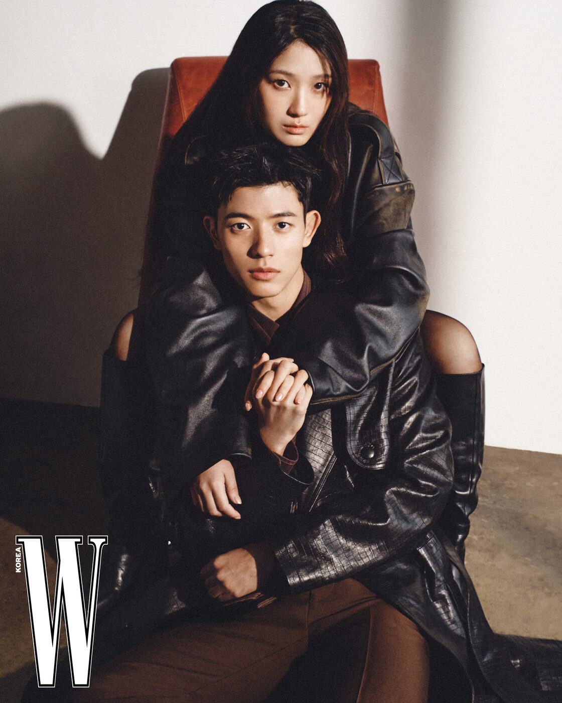 김혜윤이 입은 가죽 재킷은 코치 제품, 부츠는 스타일리스트 소장품. 로몬이 입은 트렌치코트와 팬츠는 아미리 제품.