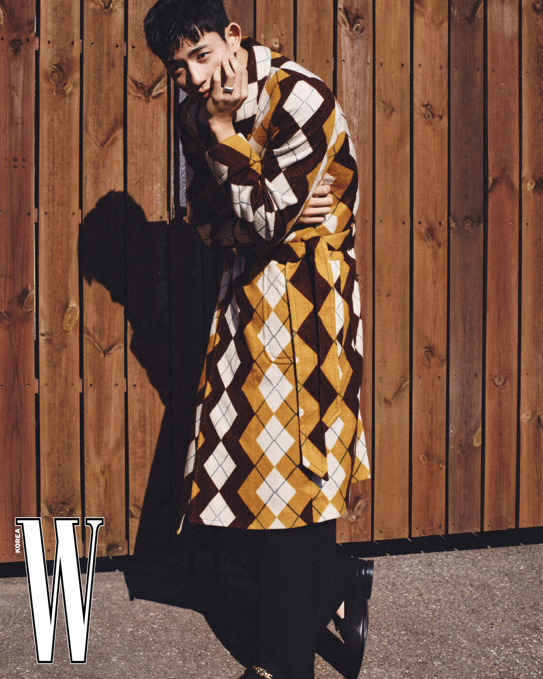 아가일 패턴 코트는 김서룡 옴므, 니트 팬츠는 베리, 로퍼는 아미리, 링은 크롬하츠 제품.