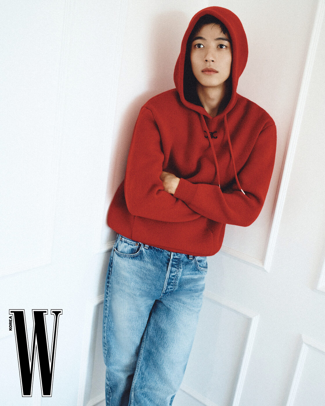 붉은색 니트 후디와 데님은 셀린느 제품.