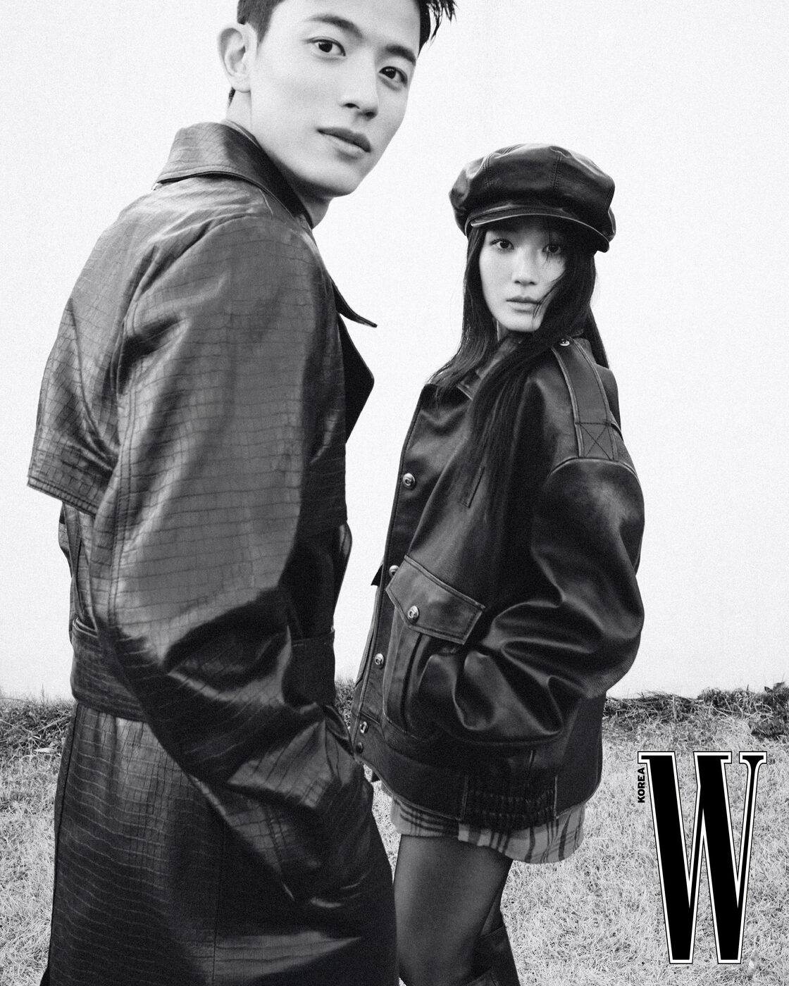 로몬이 입은 가죽 트렌치코트는 아미리 제품. 김혜윤이 쓴 베레모는 발렌티노 가라바니, 오버사이즈 재킷과 체크 셔츠는 코치 제품.