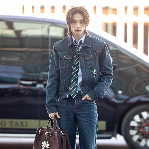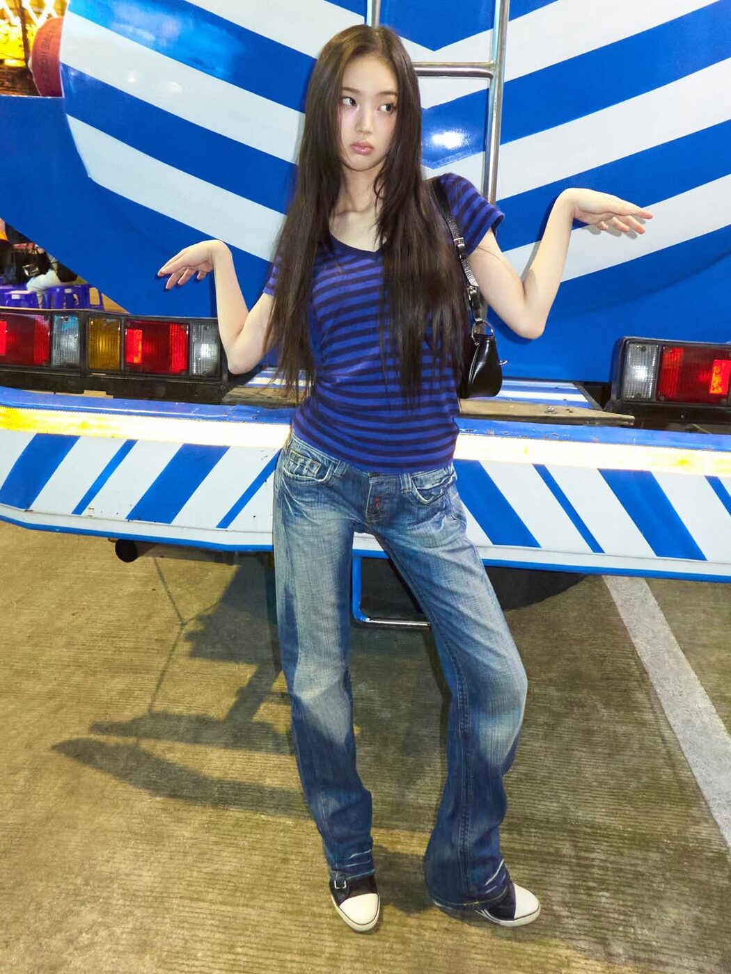 심플한 아이템들을 조합해 디테일로 재미를 주는 요즘의 스타일링과 다르게 단독으로도 존재감이 강한 아이템들로 직관적인 인상을 연출하는 것이 유행하던 시절. 크롭 톱이나 그래픽 티셔츠처럼 단독으로도 힘이 있는 피스를 중심으로 레이어드 없이 깔끔한 구성은 Y2K를 대표하는 특징인데요. 이솔은 브이넥 라인으로 가녀린 상체를 강조한 톱에 데님 팬츠를 매치해 2000년대 특유의 실루엣을 완성했습니다. 소매가 짧고 일자로 떨어지는 핏의 상의와 워싱 대비가 선명한 스트레이트 핏 팬츠로 Y2K 무드를 완벽하게 연출했어요.
