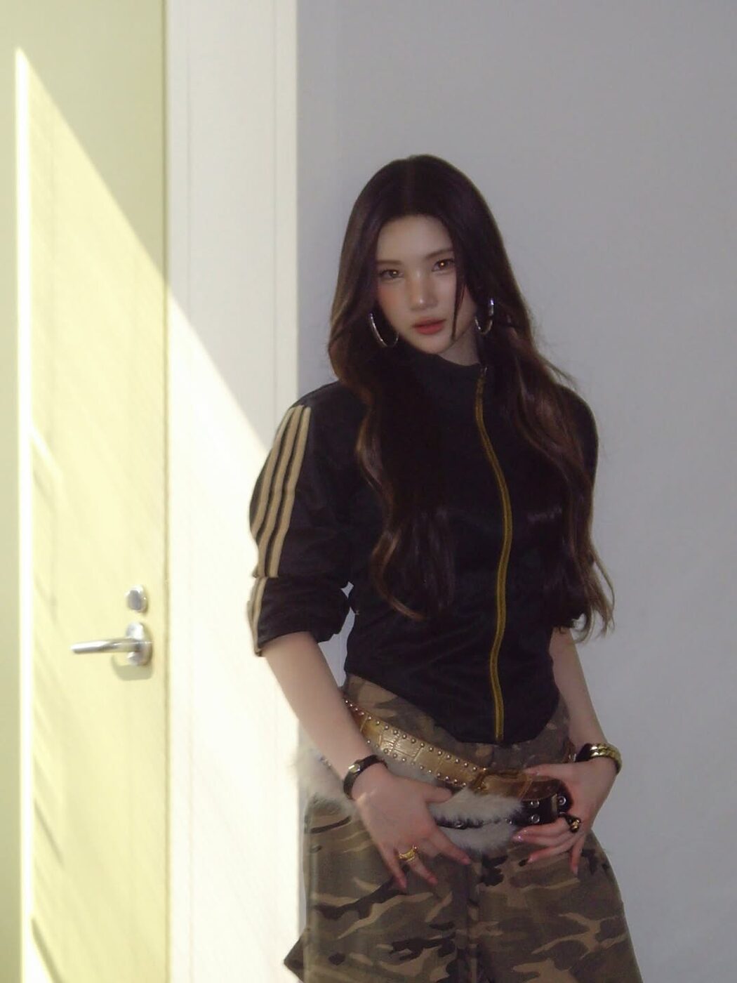 특히 시선을 사로잡은 건 ‘애니모션’ 뮤직비디오 속 이효리의 룩을 현대적으로 재해석한 주은의 스타일링. V자로 과감하게 커팅된 저지 톱에 카모플라주 패턴의 카고 팬츠를 매치해 Y2K 무드를 연출했는데요. 여기에 골드 컬러 벨트와 퍼 벨트를 골반 라인에 레이어드해 허리선을 낮추고, 볼드한 링 이어링으로 핫걸 무드를 완성했죠.