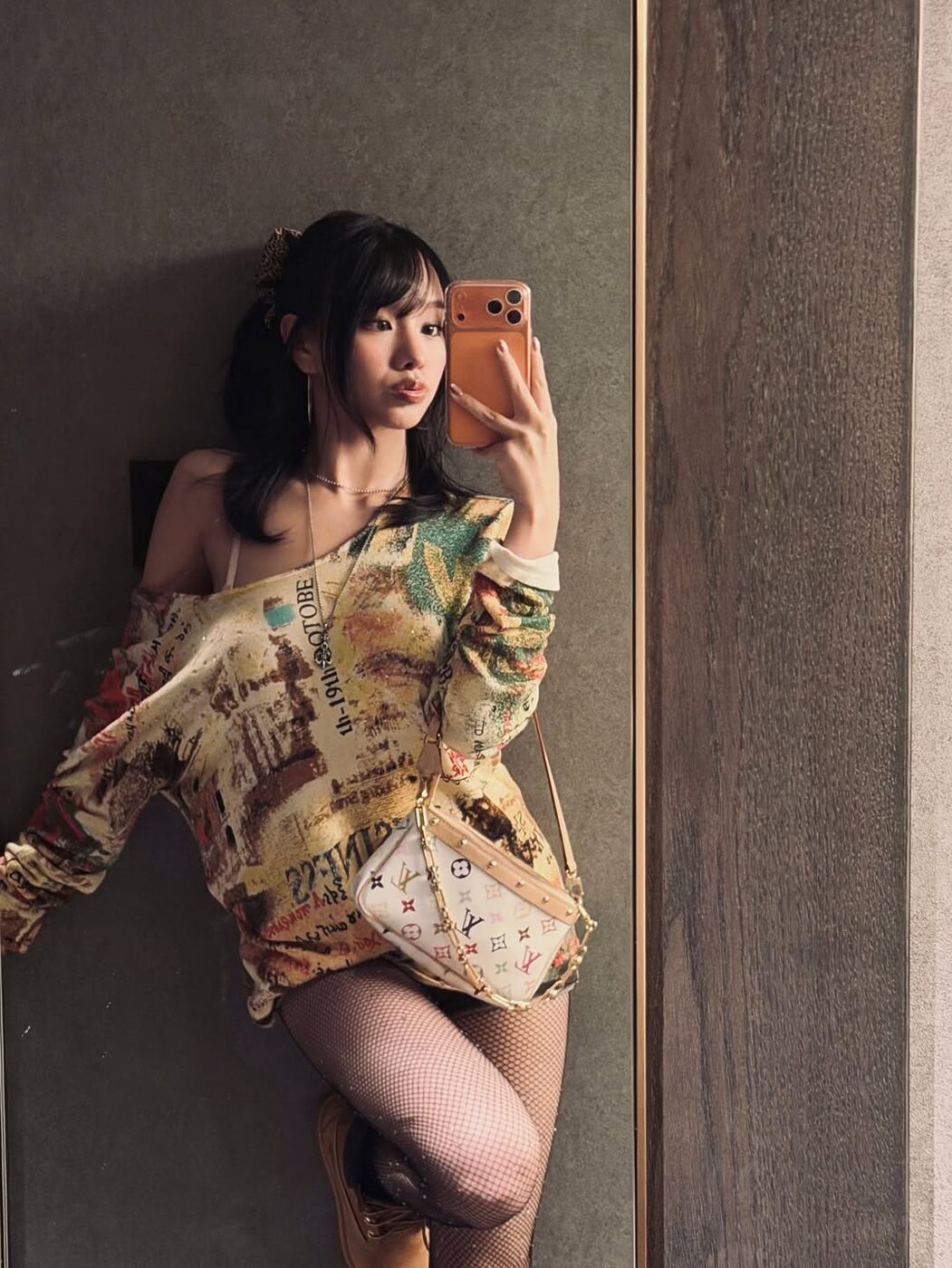 데뷔 때부터 남다른 패션 소화력으로 Y2K 룩의 대표주자로 손꼽히는 키스오브라이프 나띠. 나띠는 그래픽 패턴이 돋보이는 루즈한 오프숄더 톱에 숏팬츠를 매치하고, 망사 스타킹과 빈티지한 모노그램 패턴에 체인 디테일이 더해진 숄더백으로 화룡점정을 더했는데요. 하의 실종 실루엣에 화려한 패턴이 2000년대의 향수를 불러일으키죠.