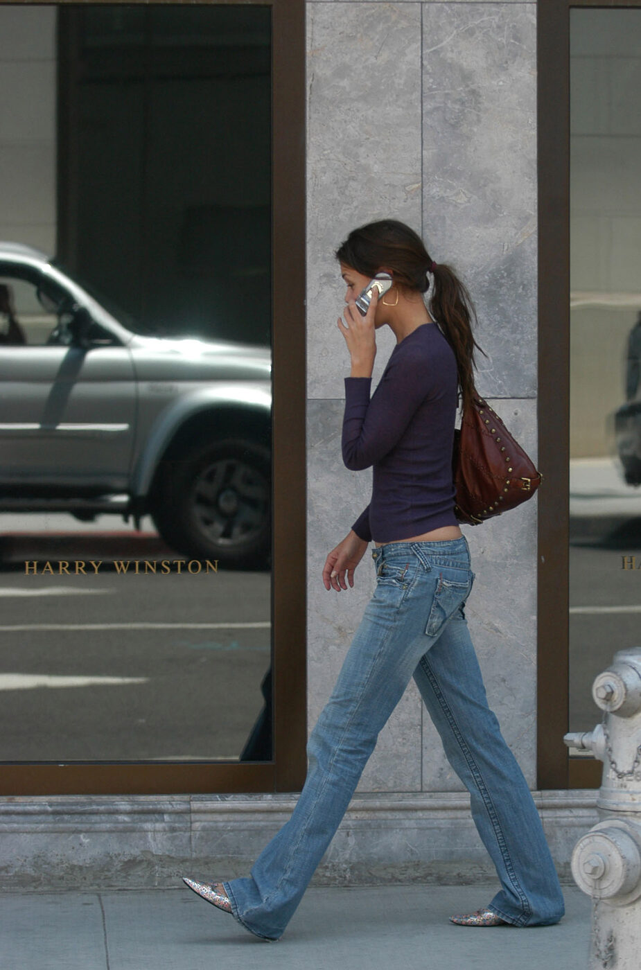마치 흘러내릴 듯, 골반에 걸쳐진 로우 라이즈가 당시 청바지 트렌드의 핵심이었어요. 여기에 다리가 길어 보이는 플레어 라인이 더해진 데님 팬츠는 바닥을 끌 정도로 길게 입으면 더욱 날씬한 롱다리를 만들어주죠. 여기에 심플하고 타이트한 기본 톱을 입고 플랫 슈즈를 신은 케이티 홈즈. 커다란 후프 이어링과 스터드 장식의 숄더백까지 20년전 룩이 동시대 가장 쿨한 옷차림이 되었습니다.