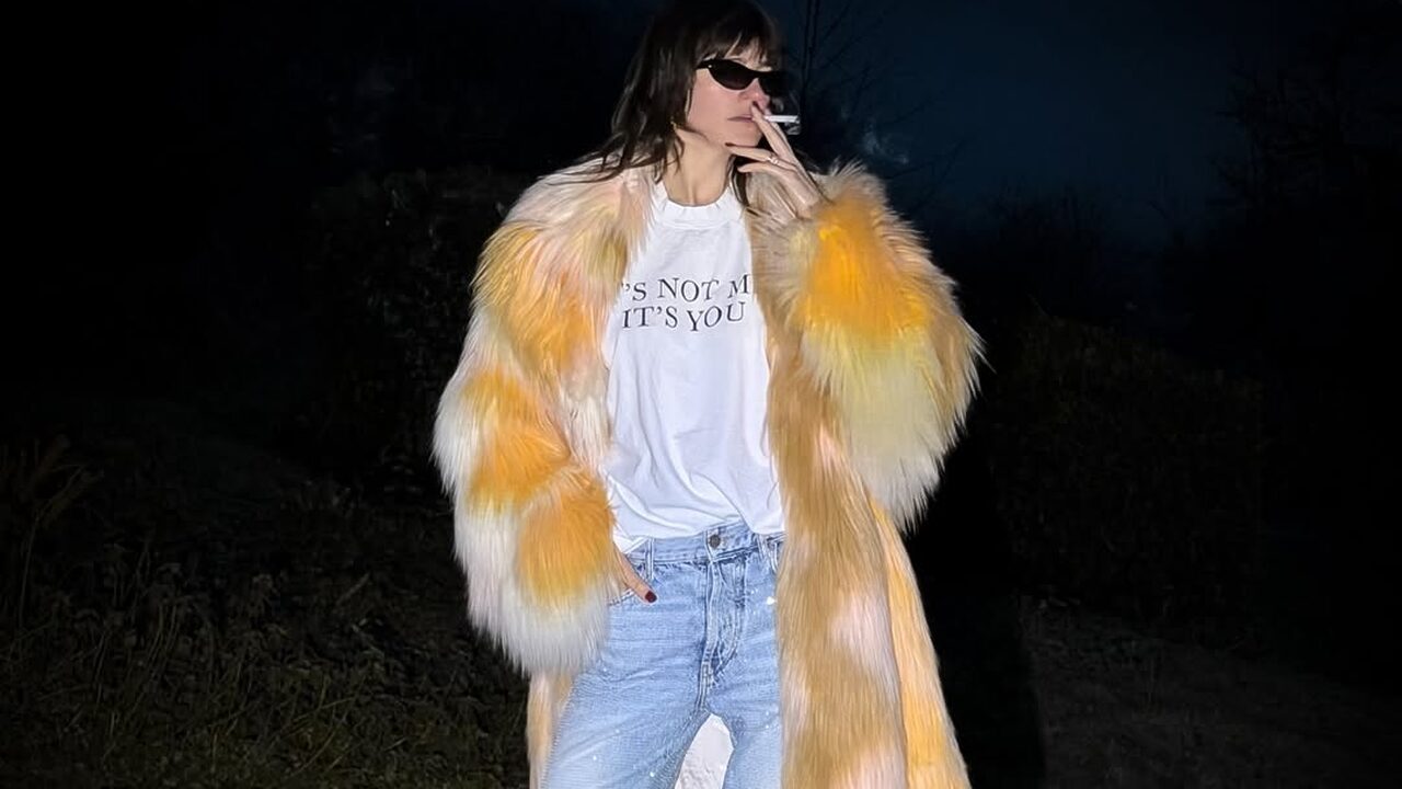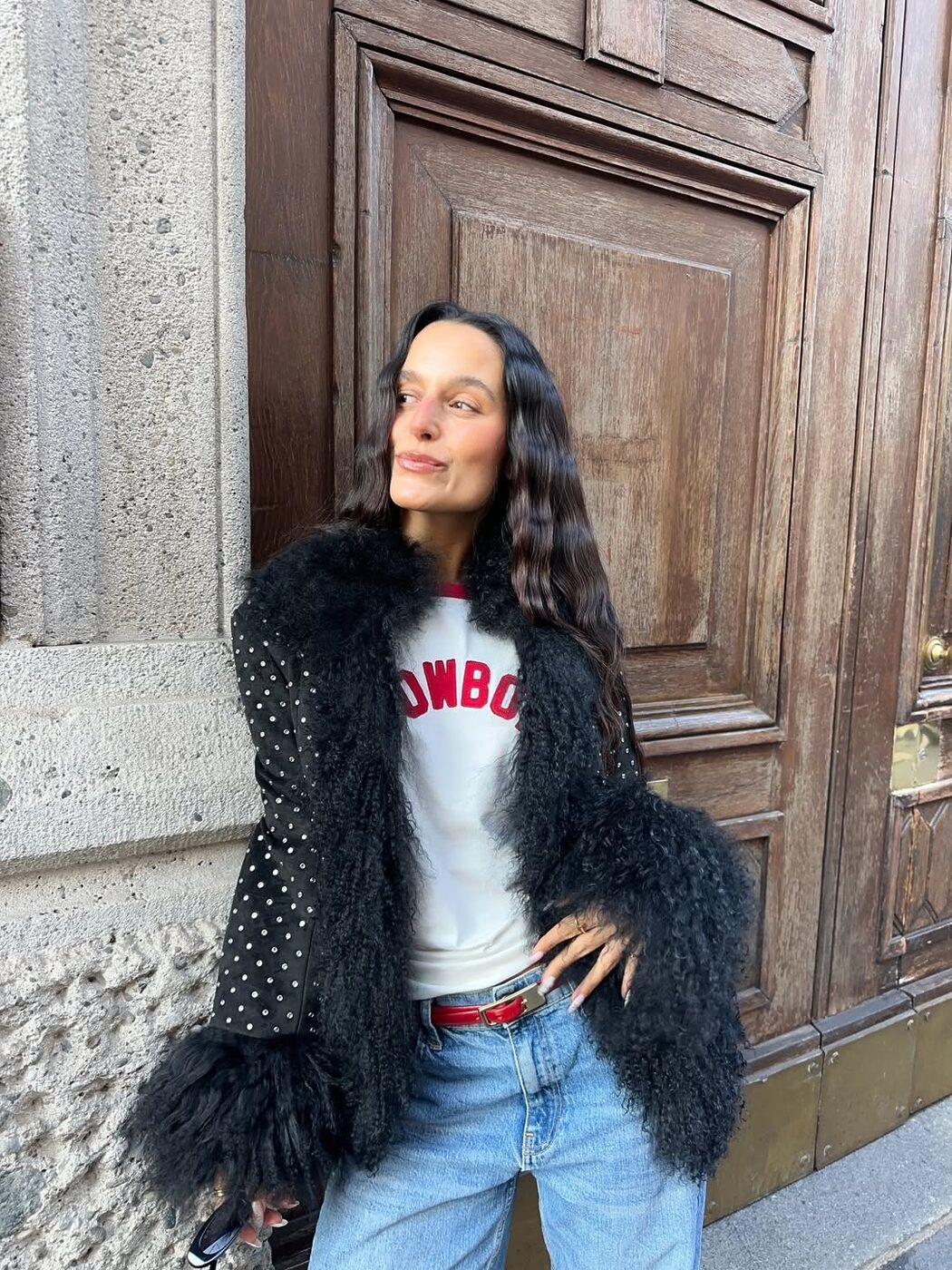 한층 가벼운 분위기의 퍼 트리밍 재킷에는 진한 레트로 감성의 그래픽 티셔츠를 추천합니다. 모헤어 퍼와 크리스털 장식이 어우러진 화려한 페니 레인 재킷에 빨간 레터링 포인트가 들어간 티셔츠를 매치했는데요. 힘을 준 아우터와 캐주얼한 그래픽이 대비가 살아나면서 전체적인 룩이 더욱 영리하고 위트 있게 느껴지죠.