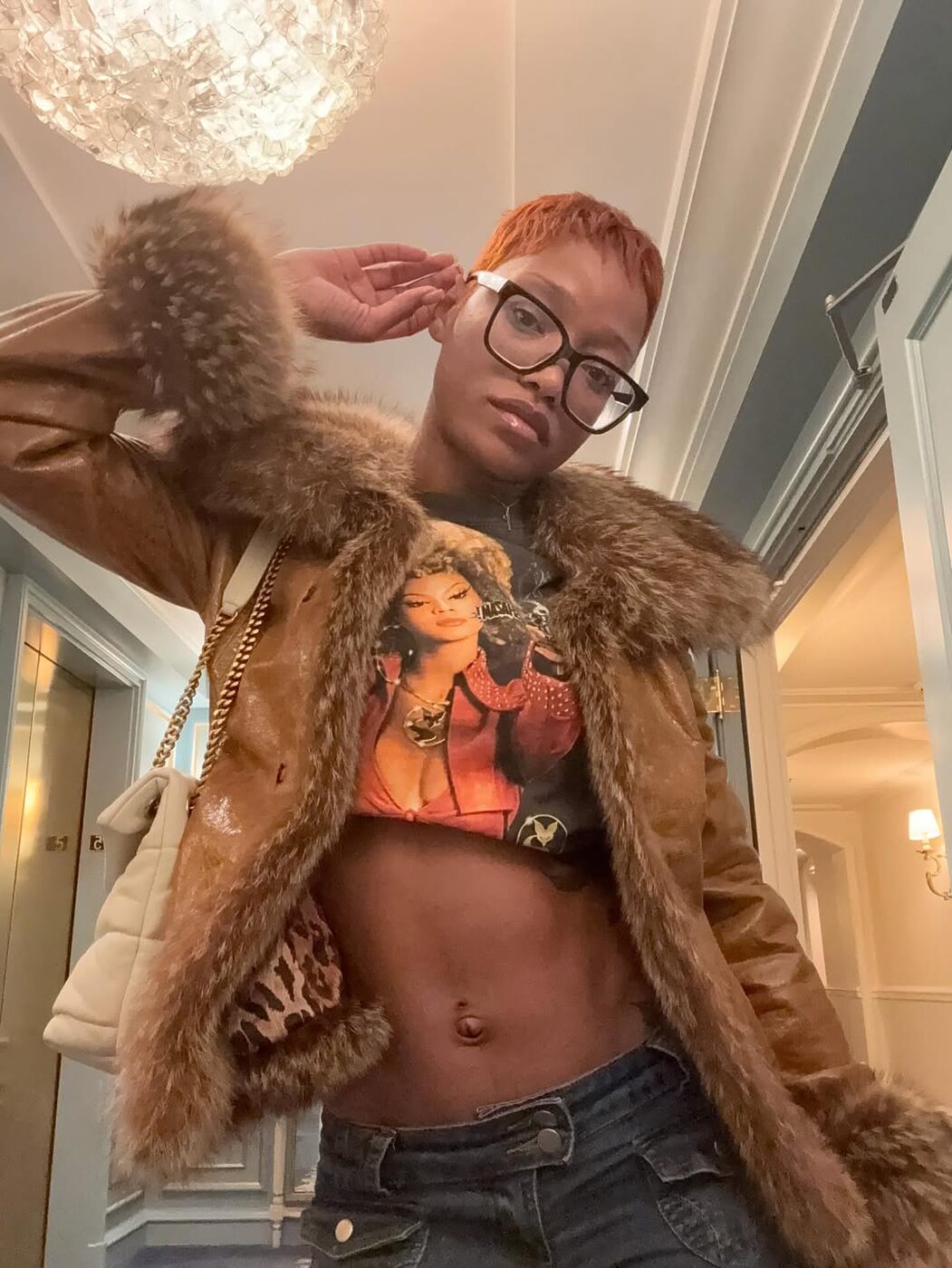 레오파드 패턴의 안감, 칼라와 소매, 헴라인까지 글래머러스한 퍼로 마무리된 브라운 레더 재킷을 선택한 배우 키키 파머. 올드하게 느껴질 수 있는 이 강렬한 아우터에 크롭 그래픽 티셔츠를 매치해 힙한 무드를 연출했습니다. 집에서 편하게 입을 법한 빈티지 그래픽 티셔츠가 퍼 아우터를 만나니 그 어떤 이너보다 감각적인 아이템으로 변신했습니다. 여기에 로우 라이즈 데님과 골드 체인이 더해진 미디 백으로 마무리해 Y2K 무드를 동시대적으로 풀어냈죠.