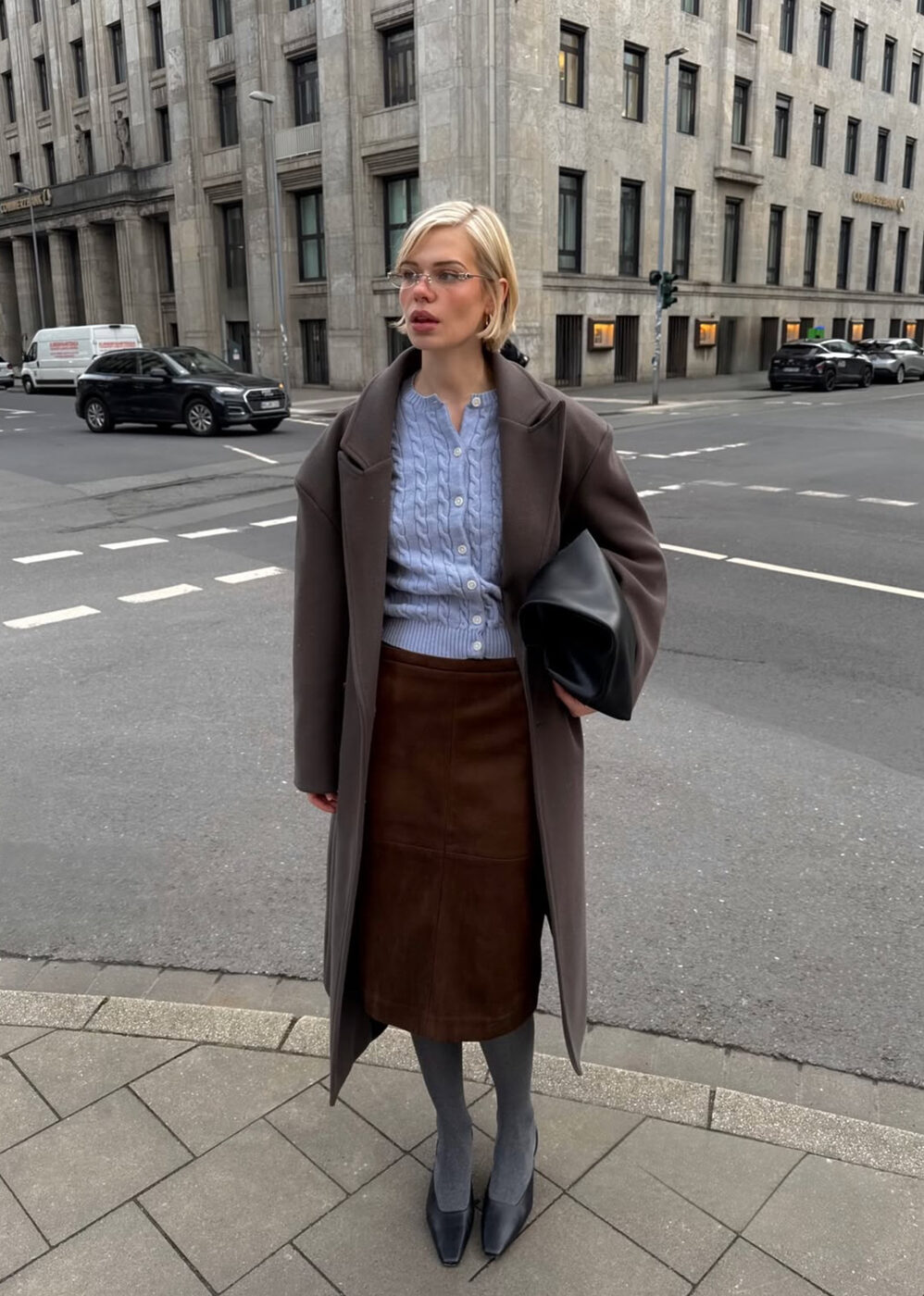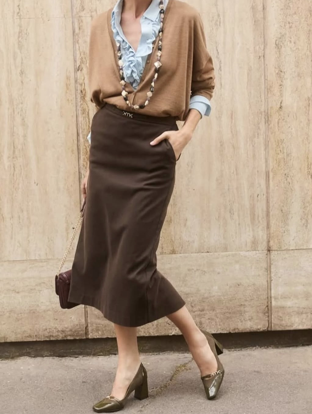 좀더 여성스러운 터치를 원한다면 러플 장식의 셔츠와 니트 가디건, 그리고 은근한 머메이드 라인의 롱 펜슬 스커트를 입어 보세요. 브라운 컬러 팔레트가 더욱 부드러운 인상을 선사합니다. 여기엔 두툼한 굽의 클래식한 펌프스가 제격이겠죠.
