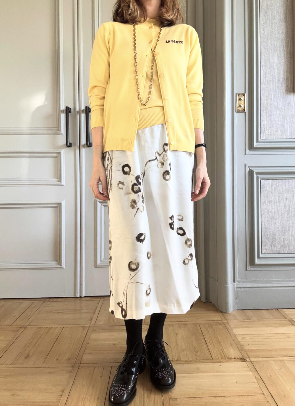 다가올 봄에는 다소 화사한 무드의 책벌레 스타일링에도 도전해 보세요. 보기만해도 달달한 버터 옐로우 컬러의 니트와 가디건 셋업에 우아한 실크 스커트를 입었죠. 답답해 보일 정도로 새까만 스타킹과 블랙 옥스퍼드화가 차분하고 학구적인 분위기를 연출해 주었어요.