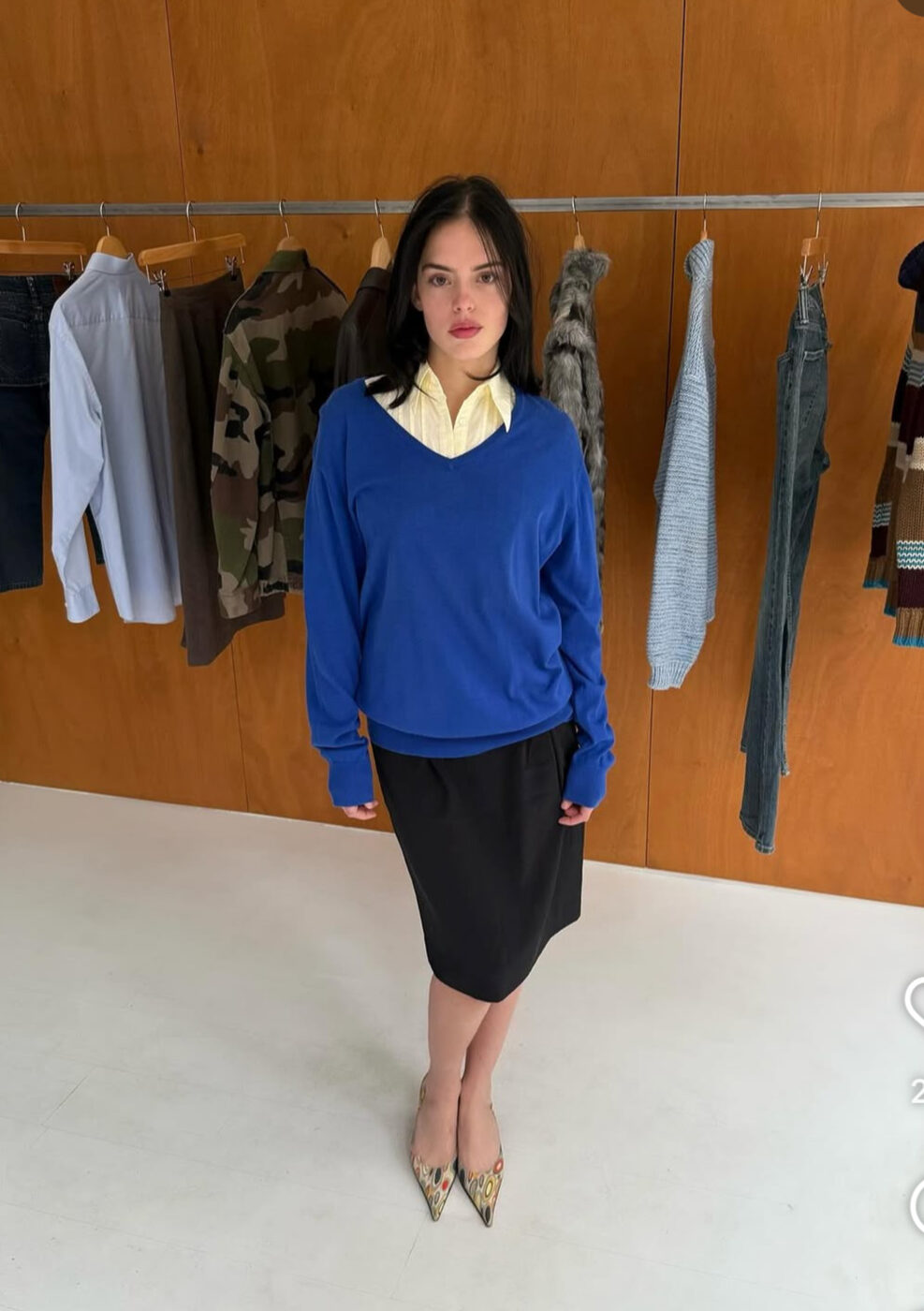 셔츠와 니트의 만남, 이 지루하고 전형적인 조합도 컬러만 잘 고른다면 세련되게 소화할 수 있습니다. 버터 옐로우 컬러의 셔츠 위에 선명한 코발트 블루 니트를 입고 아래는 기본적인 블랙 미디 스커트로 범생이 무드의 룩을 완성했어요.