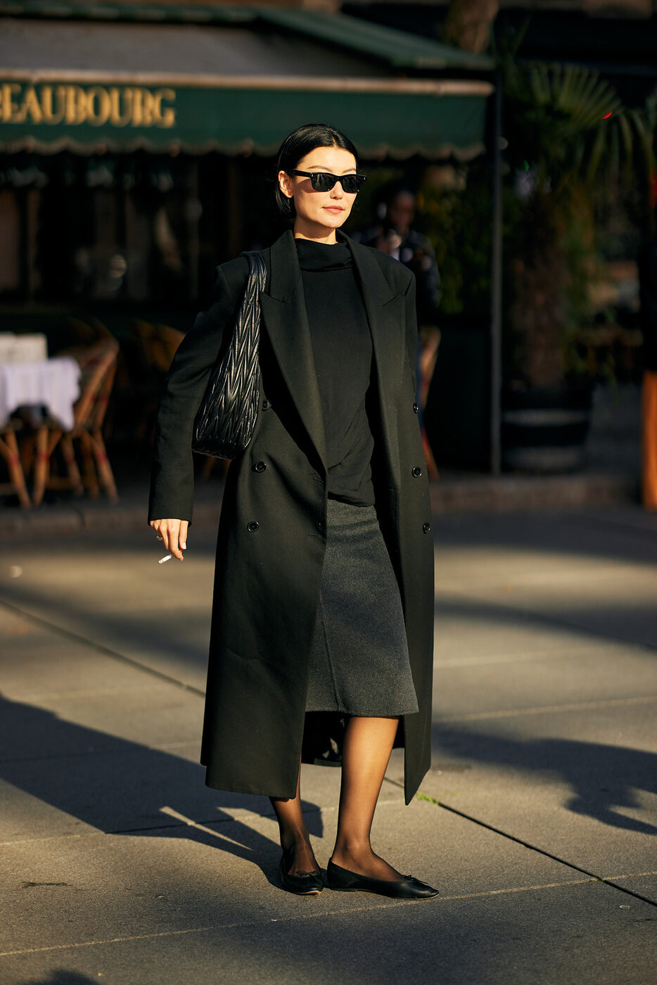 올 블랙으로 모던한 무드의 라이브러리언 스타일을 선보였습니다. 심플한 블랙 톱에 울 소재의 미디 스커트를 입고 그 위엔 롱 블랙 코트를 걸쳤어요. 여기엔 부츠나 하이힐이 아닌 투명한 까만 스타킹에 기본 발레리나 슈즈를 신어 도서관 서기 분위기를 냈어요.