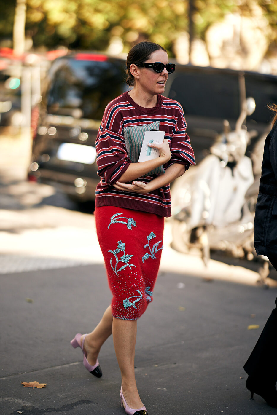 패턴과 컬러가 더해지면 한층 더 생기 넘치는 도서관 패션이 완성됩니다. 중요한 건 옷의 질감이에요. 니트 톱에 니트 소재의 패턴이 들어간 독특한 미디 스커트까지, 부드럽고도 파워풀한 룩이란 바로 이런 거죠.