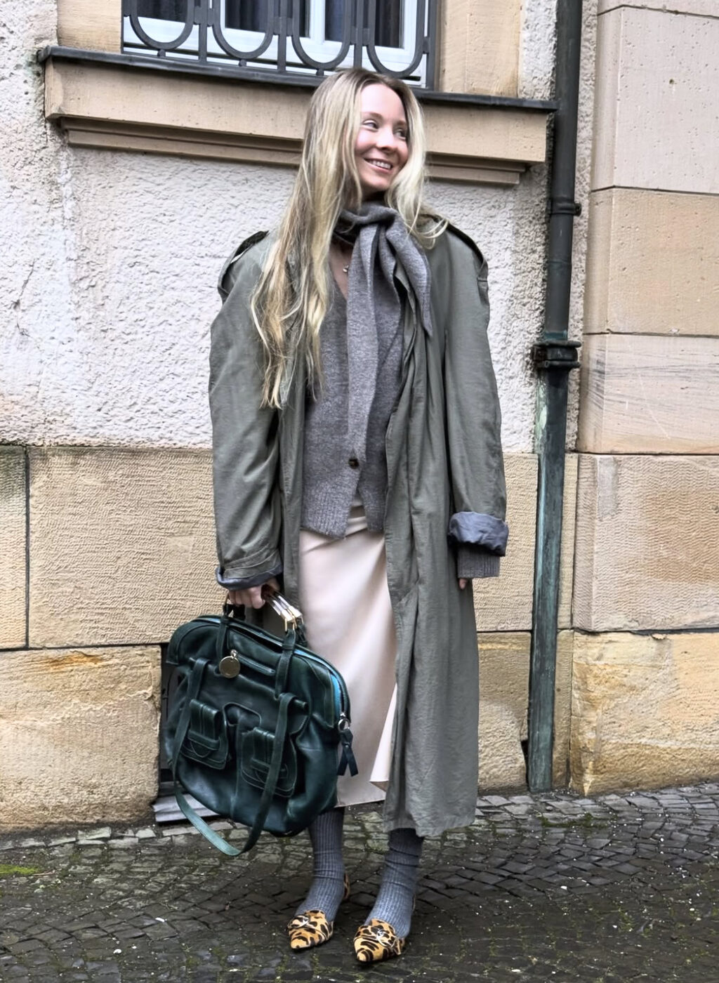 라이브러리언이라고 해서 무조건 단정하기만 한 건 아닙니다. 책 속에 빠진 너드 스타일 또한 매력적이죠. 실크 스커트에 그레이 니트 가디건 그리고 그레이 삭스에 플랫 슈즈를 신어 기본 룩을 완성했어요. 그 위엔 그런지 풍의 트렌치 코트와 책가방을 떠올리게 하는 빈티지 백으로 개성 넘치는 라이브러리언 패션을 선보였습니다.