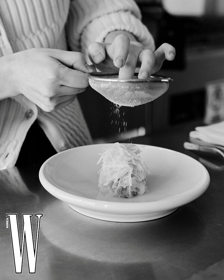“저는 ‘한식을 현대화했다’는 표현을 별로 쓰고 싶지 않아요. 한국의 식문화를 지금 우리가 쓸 수 있는 모든 도구와 조리법으로 풀어낸다고 보는 게 더 정확하죠. 서울 음식의 뿌리는 한양 음식이에요. 사람과 물자가 계속 몰리면서, 여기서 자연스럽게 복잡한 일이 벌어졌어요. 저는 그게 곧 ‘컨템퍼러리’라고 생각해요. 또 서울의 특산품은 결국 ‘사람’이고요. 지금 이 도시에 사는 사람들이 먹고, 움직이고, 살아온 방식. 그게 제가 표현하고자 하는 ‘현대 서울 음식’인 것 같아요.” 미쉐린의 별과 완벽주의적 설계로 상징되는 셰프지만, 이준이 말하는 좋은 음식의 기준은 의외로 단순하다. 그것은 완성도나 기술의 총합이 아니라, 개인의 기억에 닿는 지점이다. “음식이 아직 미술이 되지 못한 이유는 먹으면 사라지고, 다시 와도 완전히 같을 수 없기 때문이라고 생각해요. 그래서 저는 음식에 이야기와 공감이 있어야 한다고 봐요. 그래야 더 오래 기억되거든요.” 그는 덧붙인다. “저는 사람들에게 읽을거리를 던지는 요리사로 기억되고 싶어요.”