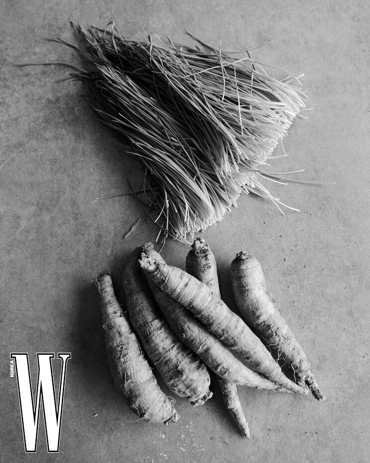 “한식의 고급화라는 말이 오래전부터 쓰였지만, 사실 제일 어려운 게 그 중간을 찾는 것 같아요. 무겁지도, 그렇다고 가볍지도 않은 음식. 특별한 날, 괜히 마음을 가다듬고 먹고 싶어지는 정성스러운 한식을 선보이고 싶어요.” 그가 특히 아쉬워하는 건 상차림 문화의 소멸이다. 여러 접시가 한꺼번에 놓이고, 손이 여기저기 오가며 자연스럽게 식탁의 대화가 만들어지던 장면들. 그래서 그는 언젠가 열다섯 코스를 네 코스로 압축한 상차림 코스를 꿈꾼다. 공예가들과 함께 기물을 만들고, 음식을 담는 방식부터 다시 생각하는 이유도 그 때문이다. 사진이 되고, 기록이 되고, 그렇게 다시 살아나는 식문화. “지금은 일하던 레스토랑을 떠나, 저만의 무대가 없잖아요. 언젠가 정성을 들인, 다정한 상차림 코스를 꼭 현실화하고 싶어요. 정말 재미있게 해볼 수 있을 것 같아요.”