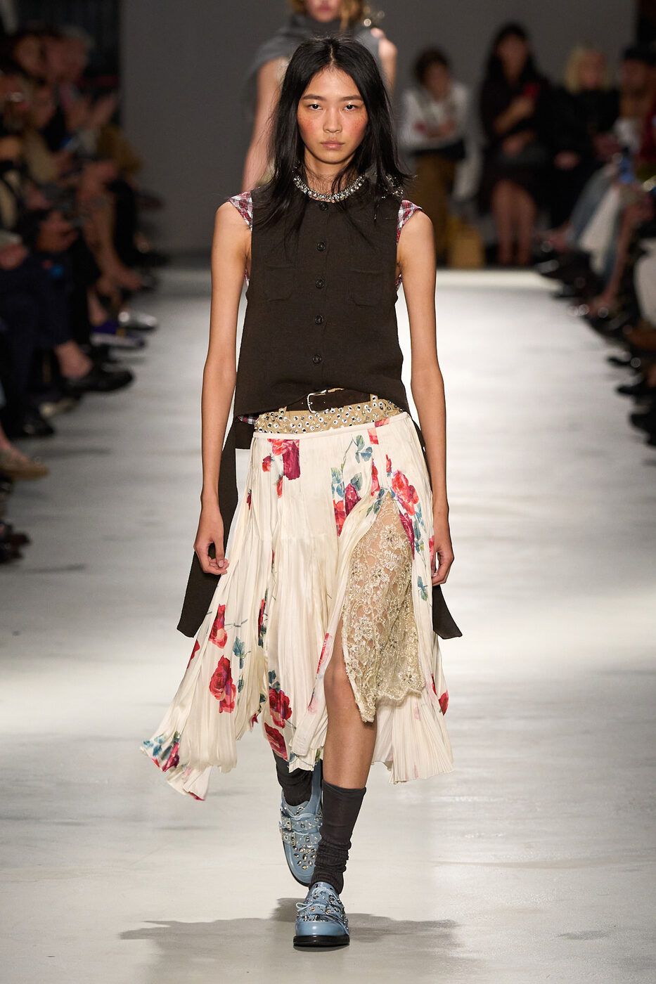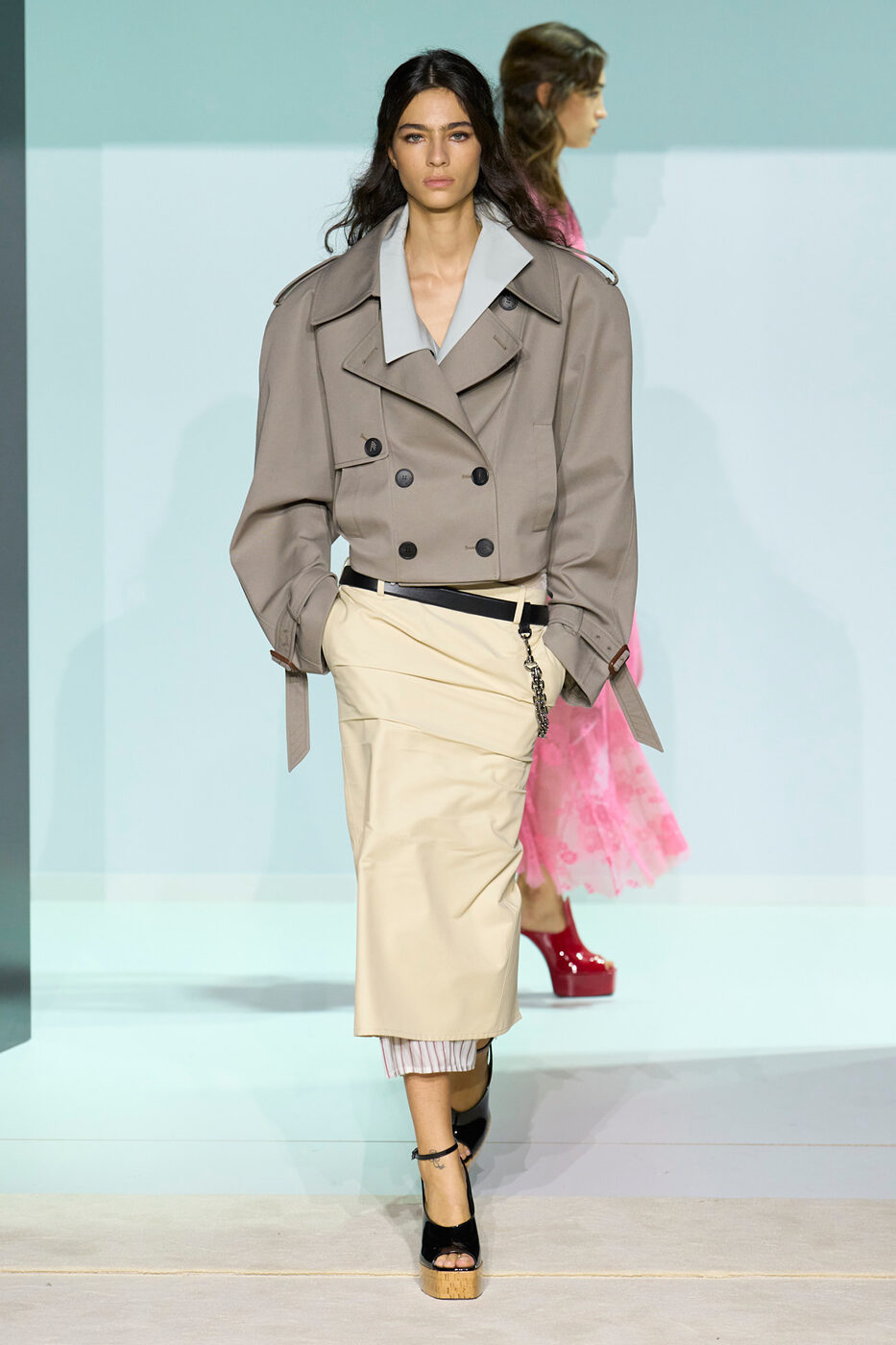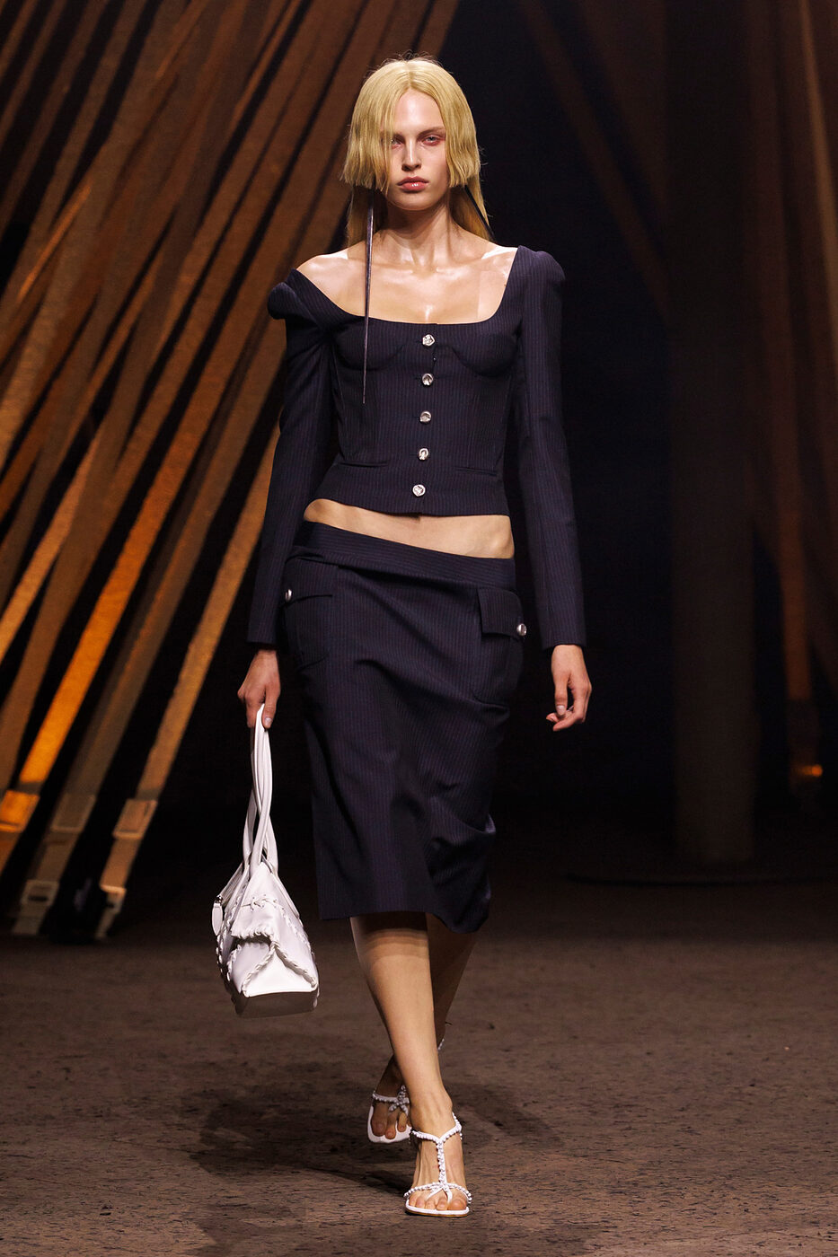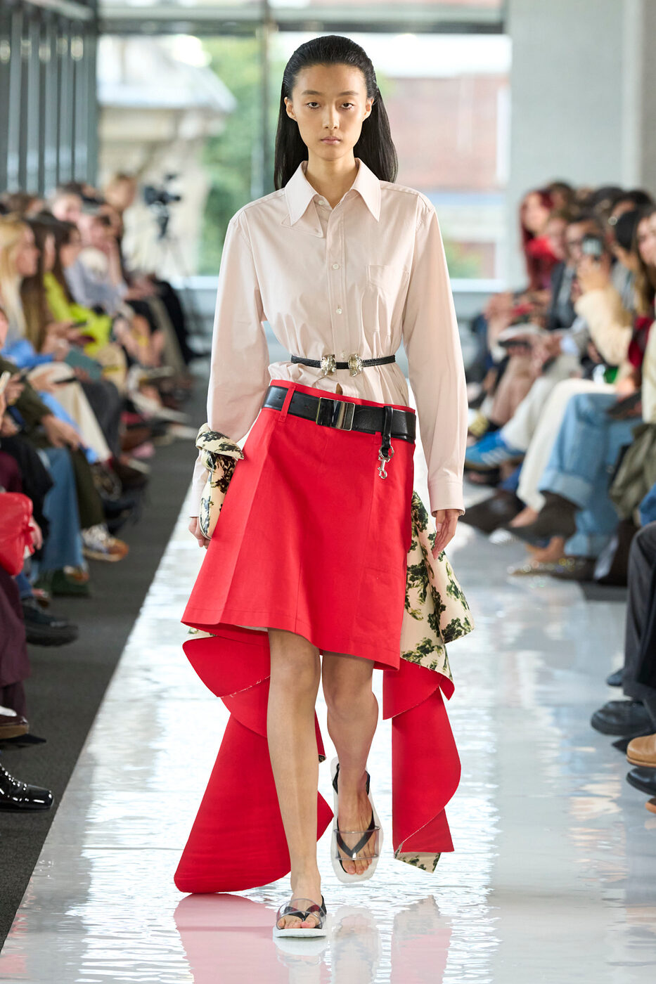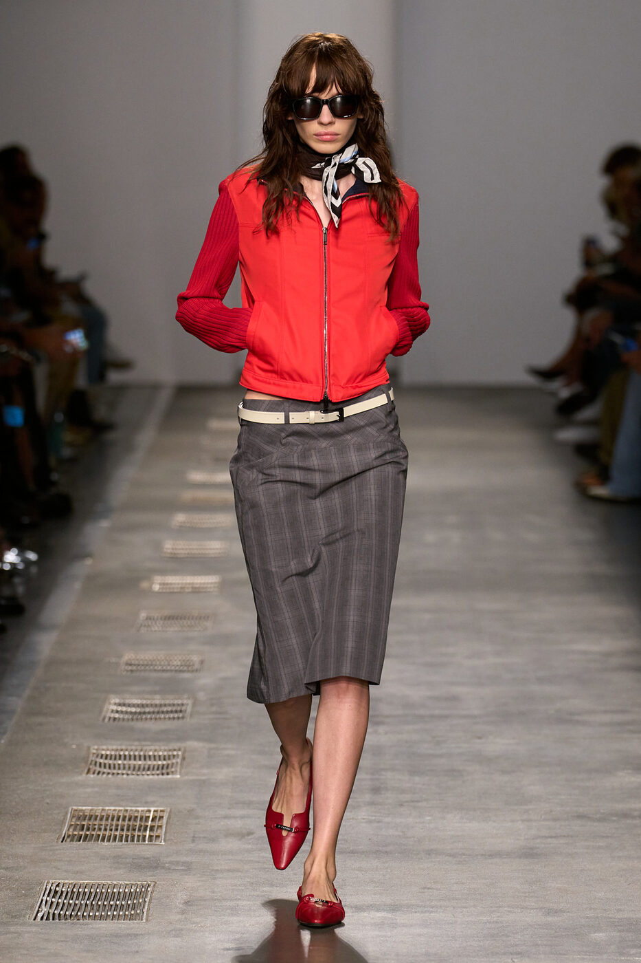 로우라이즈 스커트를 입으면 다리가 짧아 보일까 걱정된다고요? 그렇다면 뮈글러와 토가 컬렉션에서 연출한 것처럼 가느다란 씬 벨트를 더해보세요. 전체적인 룩의 여유로움을 해치지 않는 선에서 강조하고 싶은 허리 선에 벨트를 살포시 더하면, 한껏 다리가 길어 보일 테니까요.