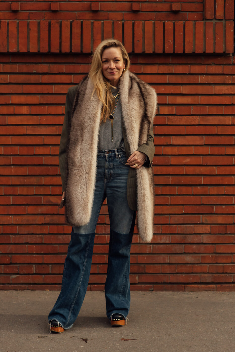 가장 기본적으로 퍼 머플러를 연출하는 법은 그저 어깨에 둘러주는 방식입니다. 마치 퍼가 트리밍된 아우터를 입은 듯, 자연스럽게 코트나 재킷을 따라 걸쳐준 퍼 액세서리는 내추럴한 무드를 연출해 줍니다. 데님에 티셔츠 차림의 캐주얼한 룩도 단숨에 고급스럽게 만들어줘요.