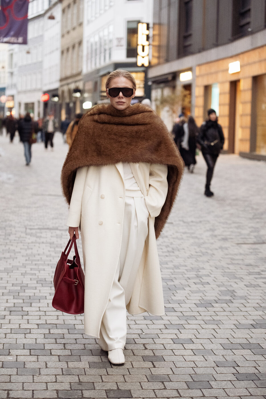 블랙 일색의 겨울 시즌에 엘레강스함이 넘치는 화이트 룩을 입기로 했다면 너무 춥거나 빈약해 보이지 않도록 스타일링을 해야 합니다. 크림 톤의 팬츠와 화이트 톱, 그리고 화이트 코트와 슈즈까지 올 화이트의 모던한 무드로 매칭했어요. 대신 버건디 컬러의 빅 토트 백과 케이프처럼 두른 브라운 퍼 숄이 시선을 사로잡았죠. 기교를 부리지 않은, 그저 툭 걸쳐 준 듯 연출한 퍼가 더욱 고급스러워 보입니다.