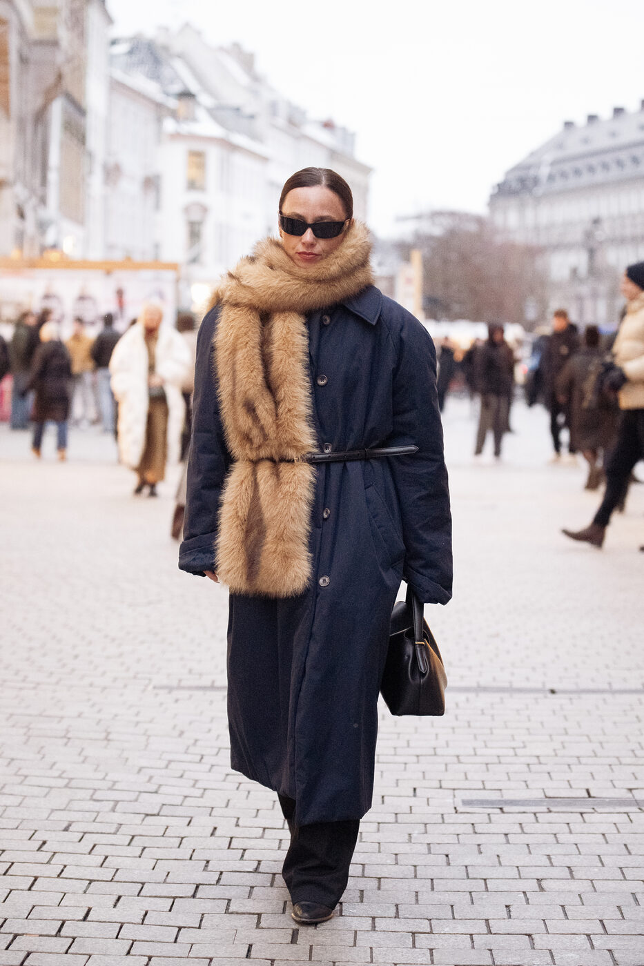 퍼를 그냥 둘러만 주기엔 부족하다 느껴진다면 벨트를 활용해 보세요. 블랙의 롱 코트 위에 헤어리한 브라운 머플러를 휙 두르고 블랙 벨트로 단단히 고정해 주면 되죠. 한층 더 구조적이고 시크한 옷차림을 완성해 준답니다.