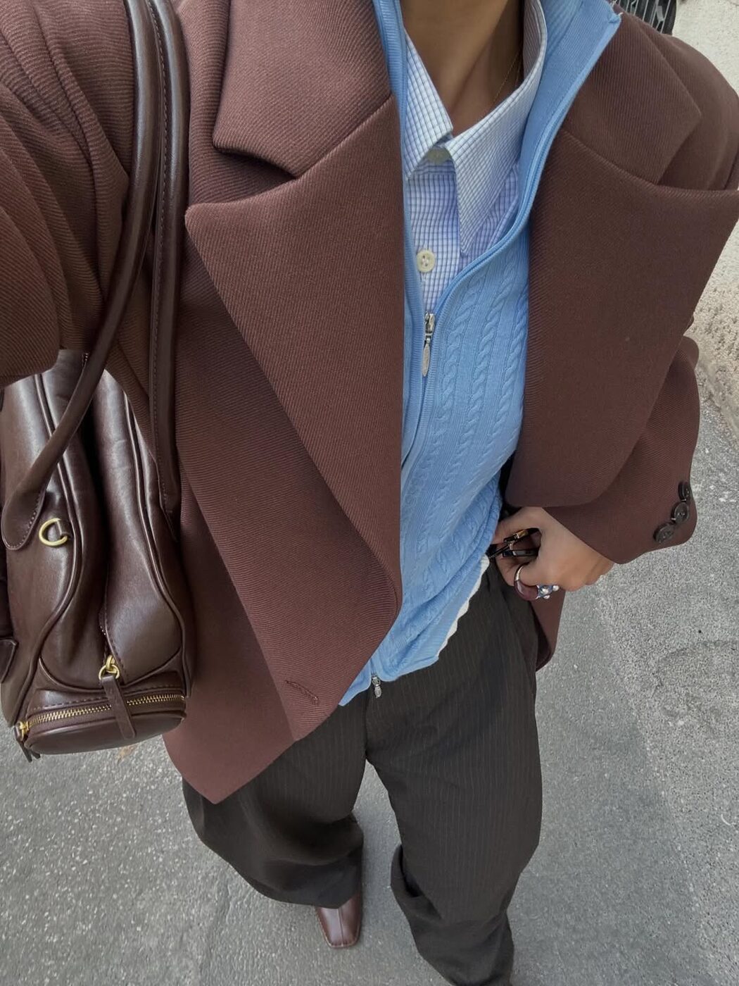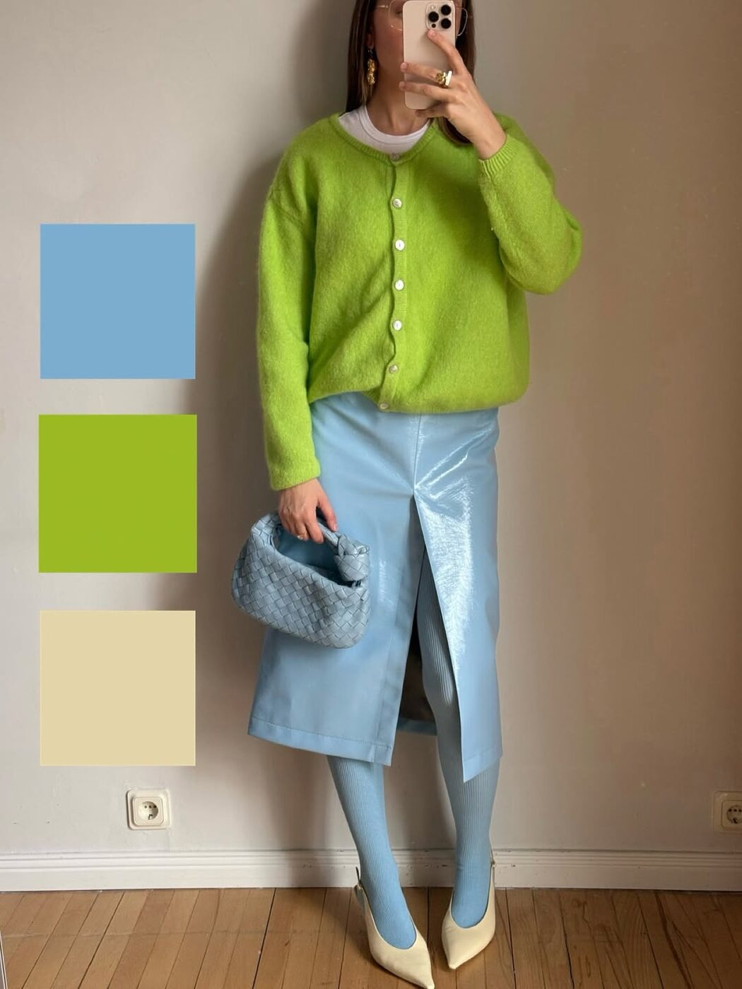 컬러 조합도 다양하게 활용할 수 있어요. 화이트와 매치하면 시원하고 맑은 느낌이 극대화되고, 베이지나 브라운와 함께하면 부드럽고 따뜻한 무드가 완성돼요. 블랙과의 조합은 깔끔하면서도 대비가 살아나 조금 더 클린한 분위기를 만들어주죠. 봄 느낌을 확실히 내고 싶다면 파스텔 그린이나 핑크처럼 밝은 톤과 매치해보세요. 상큼하고 경쾌한 분위기가 한껏 살아나요. 처음에는 화이트나 브라운 같은 무난한 컬러와 가볍게 시작하고, 날씨가 조금 더 풀리면 파스텔 컬러계열까지 확장해 즐겨보세요.