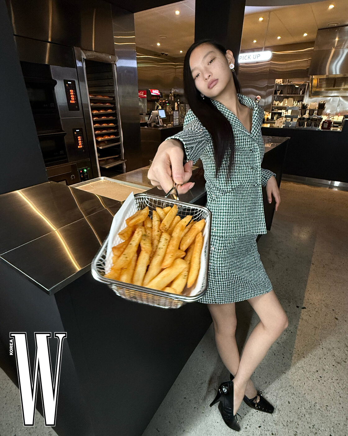 데이지 이어링, 체크 패턴 재킷, 스커트, 리본 장식 펌프스는 가격 미정으로 디올 제품.