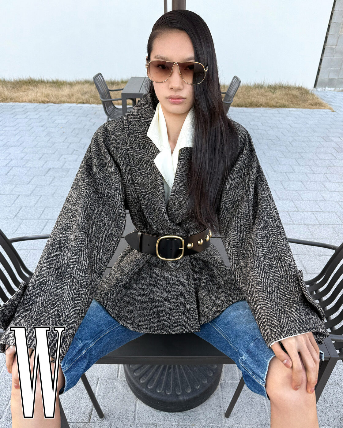 선글라스는 67만원대로 미우미우, 재킷은 4백79만원, 셔츠는 가격 미정, 벨트는 1백38만원, 데님 팬츠는 1백41만원으로 끌로에 제품.