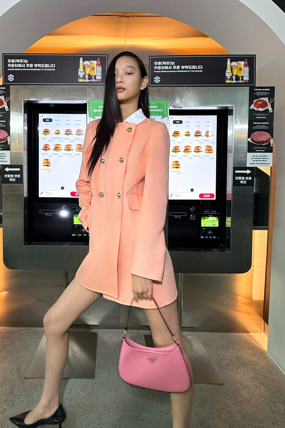 분홍 코트와 숄더백은 가격 미정, 슈즈는 1백69만원으로 프라다 제품.