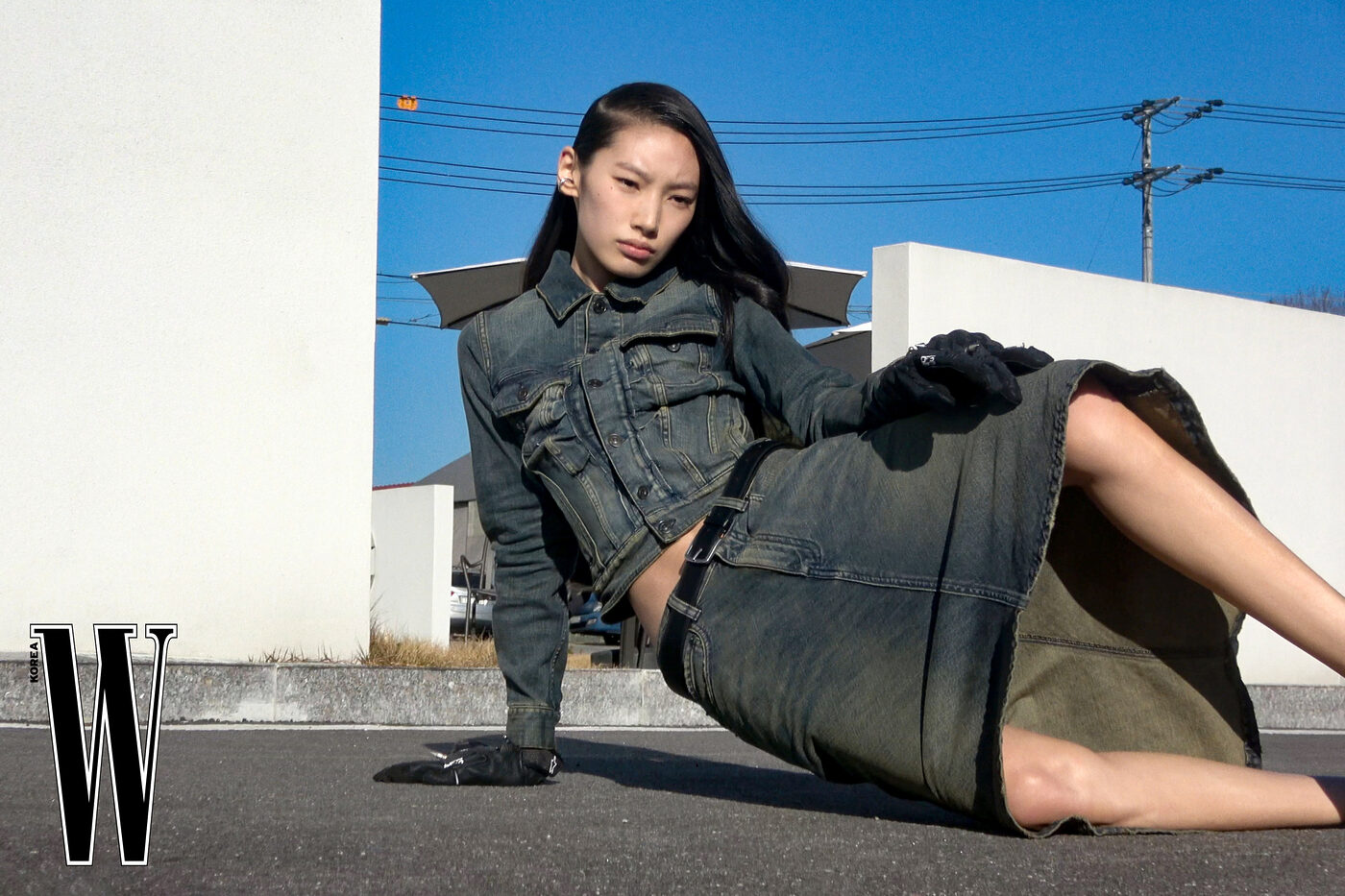 데님 재킷은 2백85만원, 미디스커트는 2백2만원, 벨트는 56만원, 이어커프와 장갑은 가격 미정으로 발렌시아가 제품.