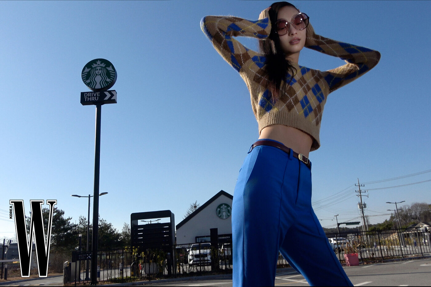 선글라스는 60만원대로 미우미우, 타탄체크 스웨터, 울 팬츠, 벨트는 가격 미정으로 셀린느 제품.