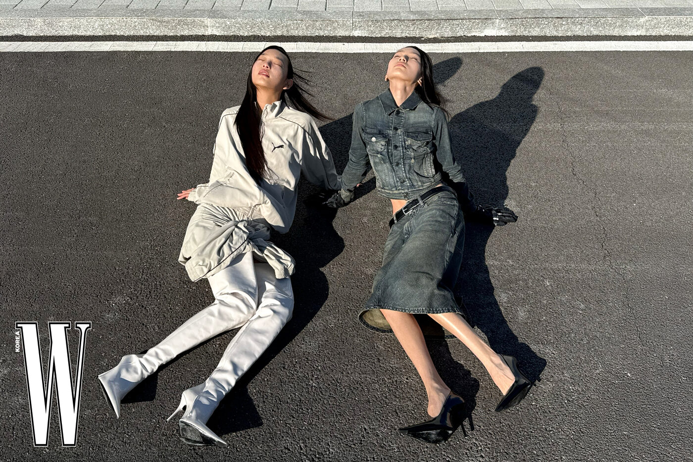 푸마 트랙슈트 톱은 3백28만원, 푸마 트랙슈트 스커트는 3백54만원, 흰색 부츠는 가격 미정으로 발렌시아가 제품. 데님 재킷은 2백85만원, 미디스커트는 2백2만원, 벨트는 56만원, 장갑은 가격 미정, 펌프스는 1백70만5천원으로 발렌시아가 제품.