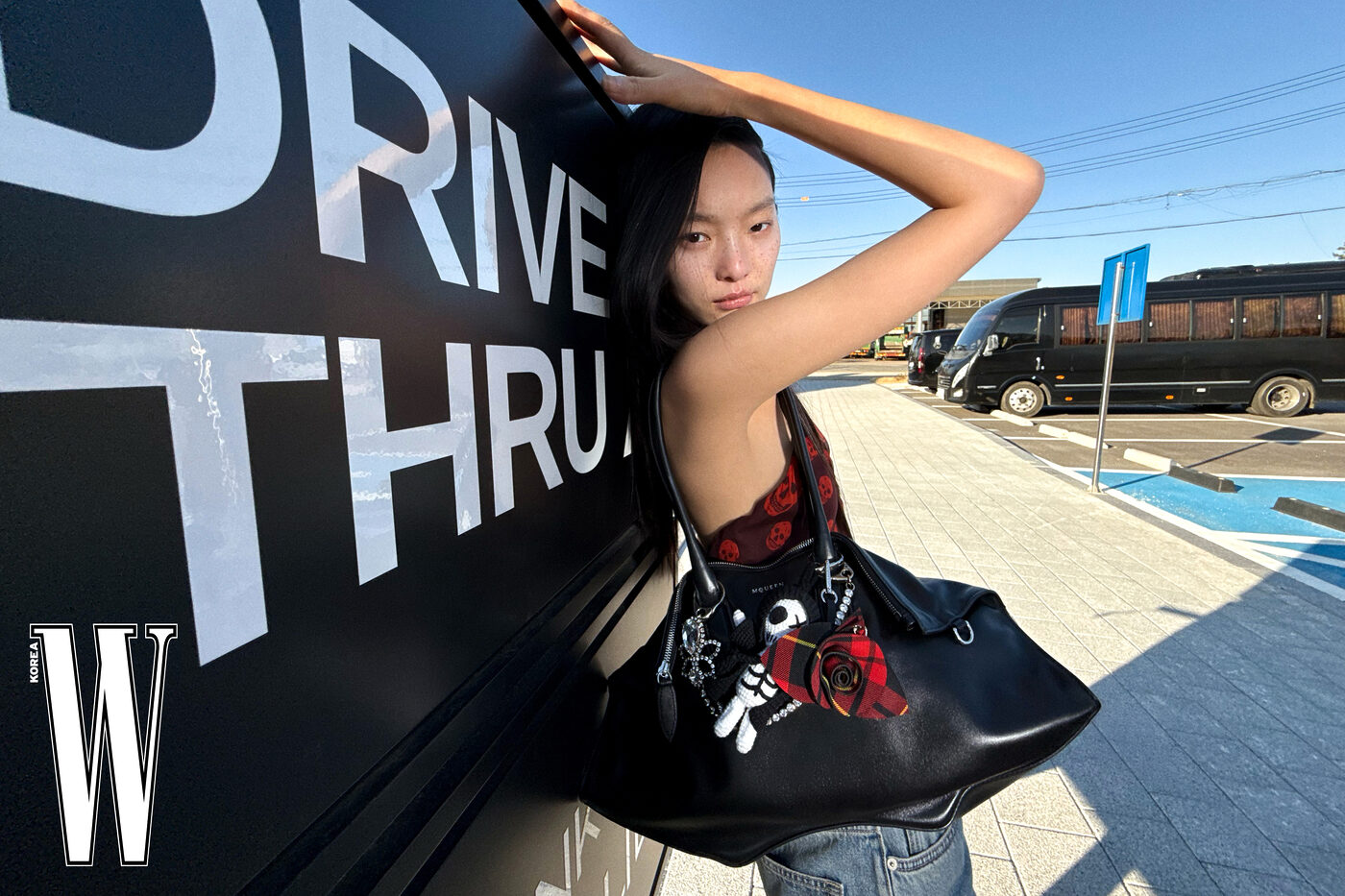 해골 프린트 톱은 1백83만원, 데님 팬츠는 1백49만원, 백은 3백32만원, 백 체인은 1백4만원, 타탄체크 참은 59만원, 해골 인형 참은 65만5천원으로 맥퀸 제품.