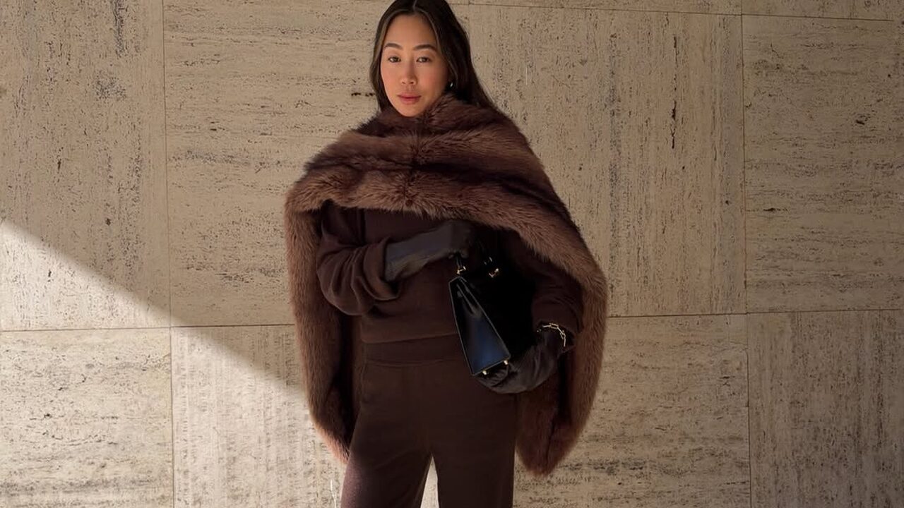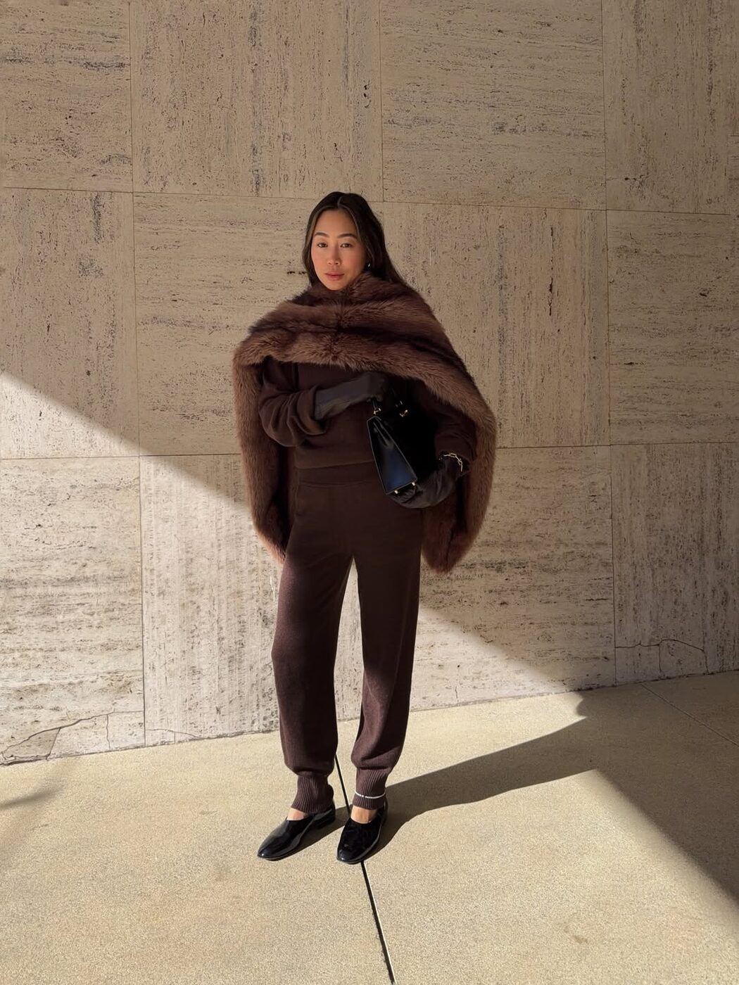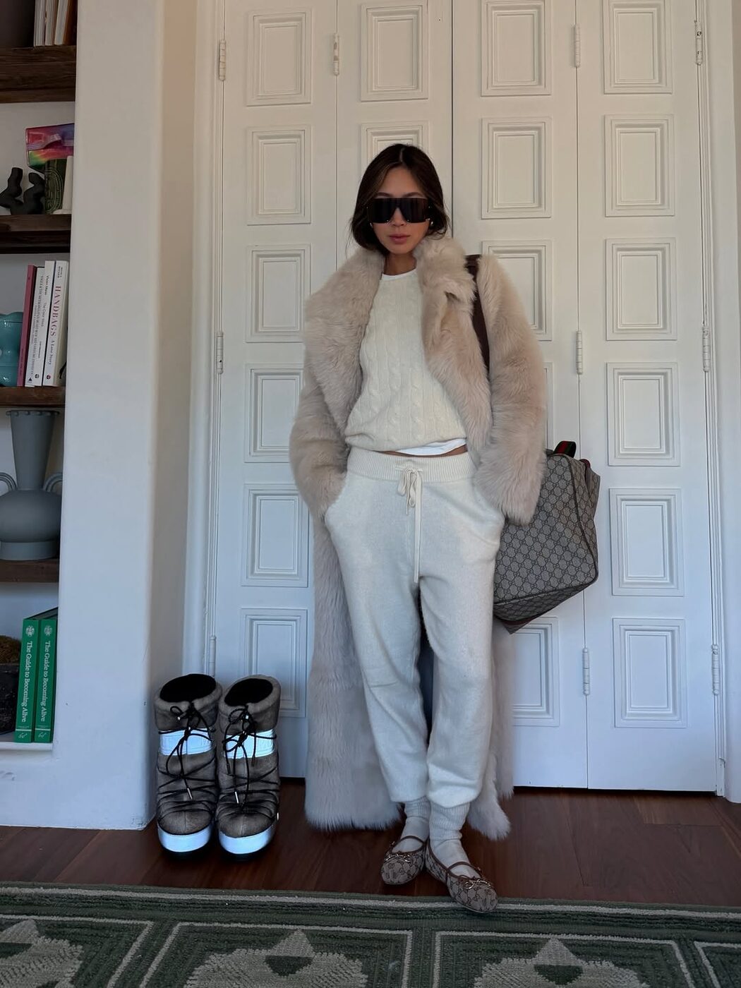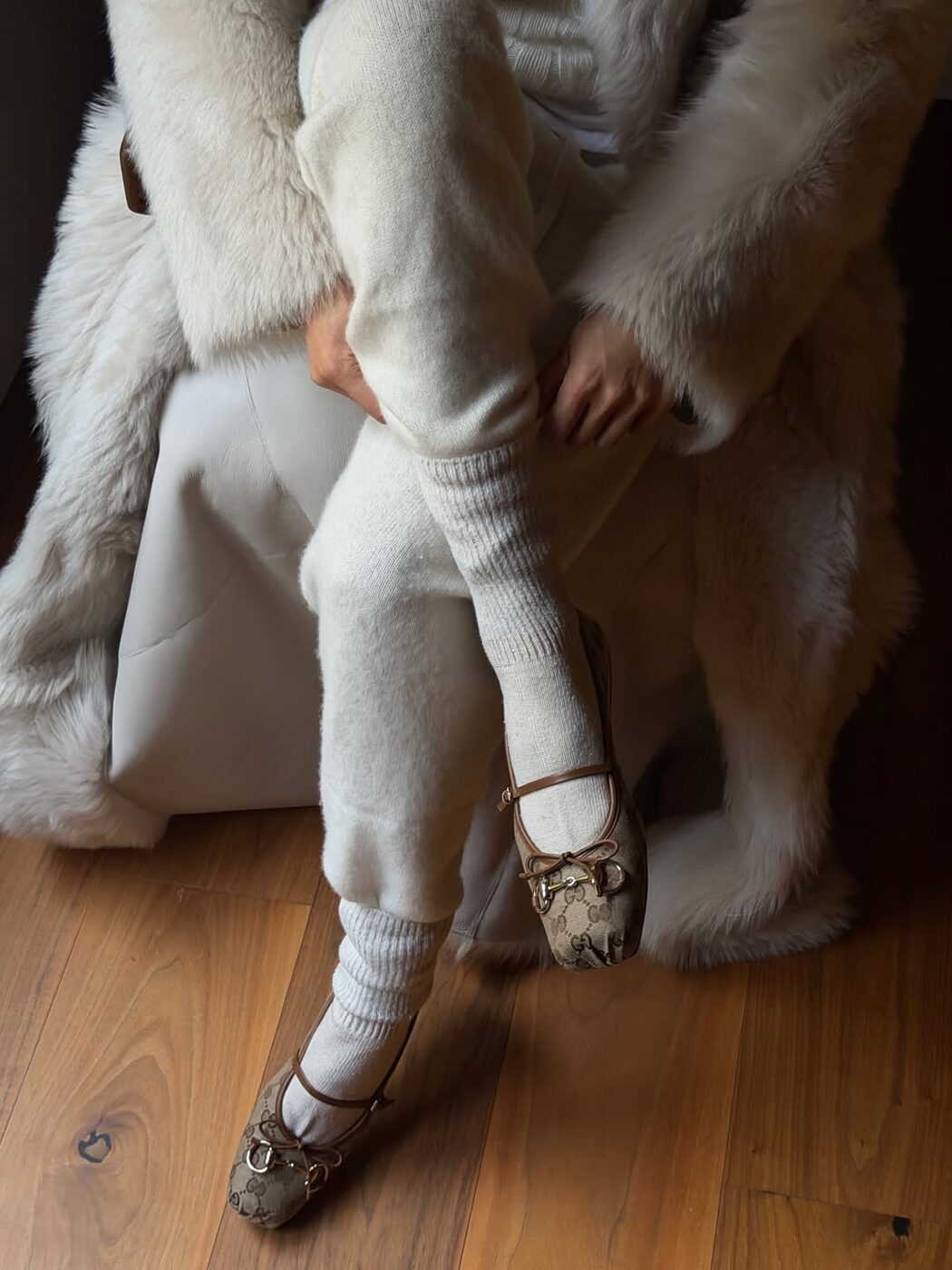 부드러운 니트 셋업과 큼지막한 퍼 스툴로 럭셔리한 무드를 연출할 인플루언서 아미 송. 여기에 플랫 슈즈를 더해 뻔하지 않은 콰이어트 럭셔리 룩을 완성했습니다. 니트 소재의 조거 팬츠는 너무 캐주얼 하지 않고 정제된 스타일링을 보여줄 수 있는 아이템인데 발등을 덮는 모던한 디자인의 플랫 슈즈가 더없이 잘 어울리네요. 또한 한쪽 발목에만 얇은 앵클릿을 더한 디테일이 한끗 차이의 감각을 보여주죠.
